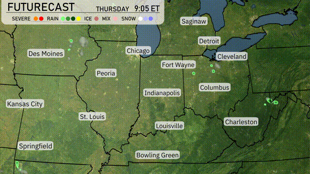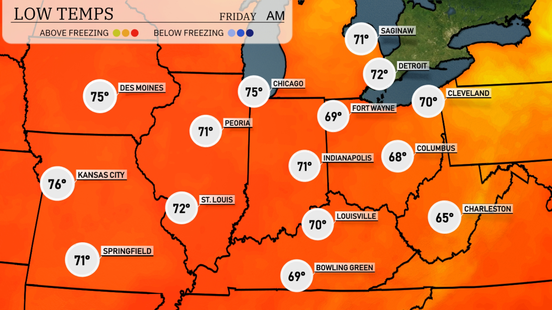 Tonight, Chicago will see a low of 75 degrees, while Des Moines is expected to drop to 75 as well. Indianapolis will register a cooler 71 degrees, with Fort Wayne at 69. Columbus will experience a chilly low of 68, and Charleston rounds out the forecast at 65 degrees.