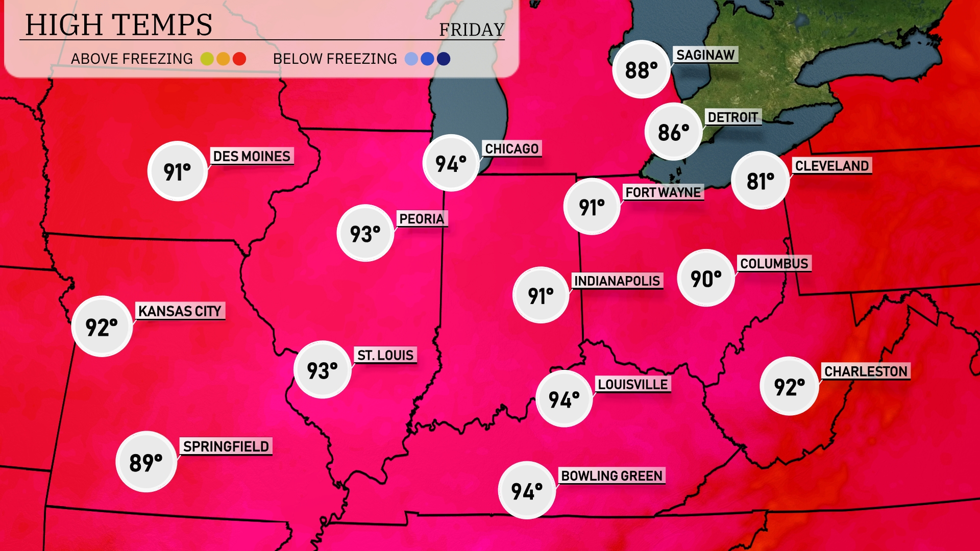 This afternoon, the Midwest is feeling the heat with highs reaching 93 degrees in Kansas City and 91 degrees in St. Louis. Peoria isn’t far behind with a high of 91, while Indianapolis and Fort Wayne both sit at 90. In Chicago, expect a milder day with a high of 88 degrees. To the north, Saginaw and Detroit are experiencing slightly cooler temperatures, topping out at 83 and 85 degrees respectively.