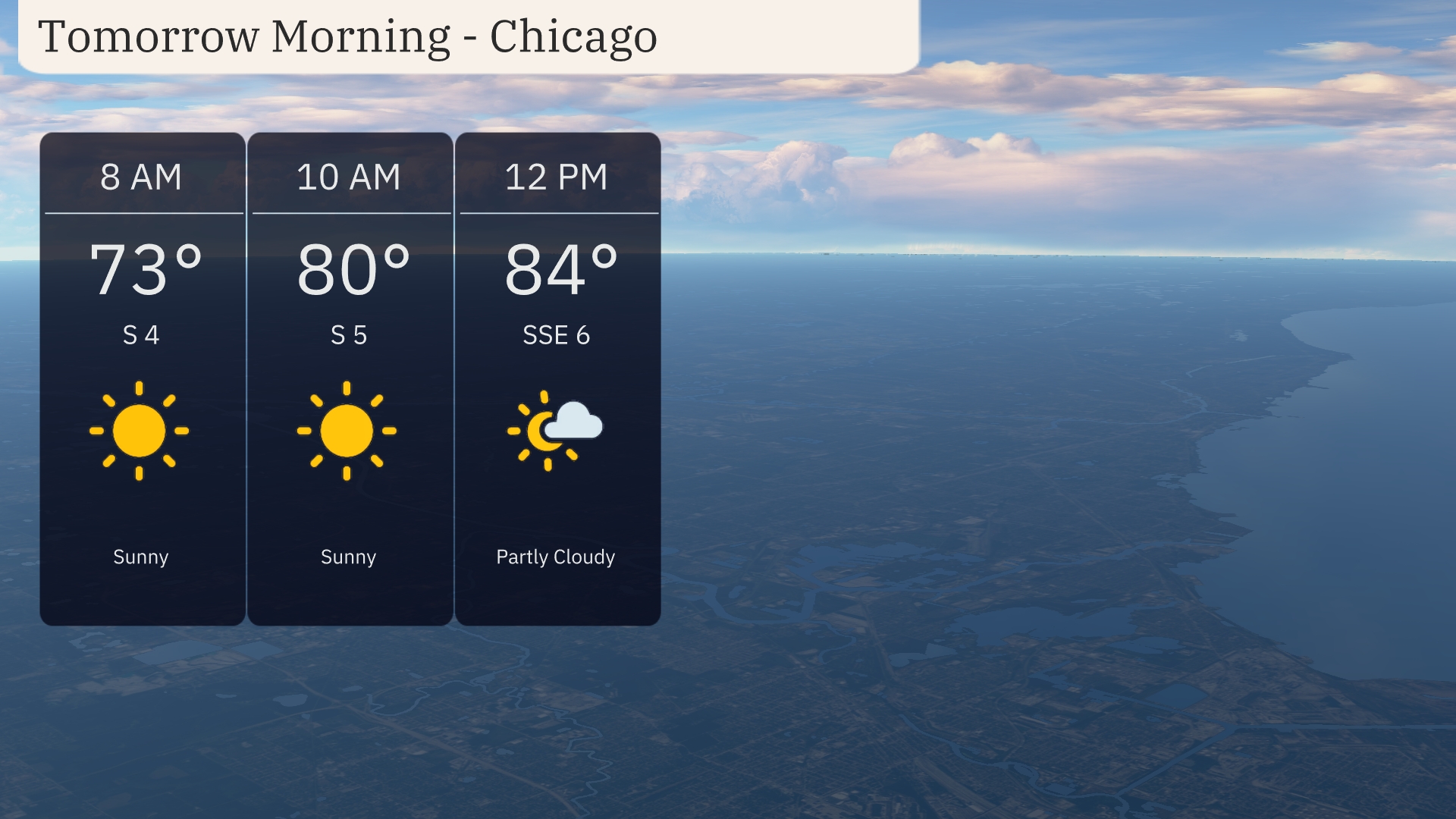 Expect a sunny start to tomorrow morning in Chicago with temperatures beginning at 73 degrees by 8 AM. As the morning progresses, the temperature will rise to 80 degrees by 10 AM with continued sunshine. Winds will be steady, coming from the south at 5 miles per hour. By late morning around 12 PM, anticipate partly cloudy skies with temperatures reaching 84 degrees and a south-southeast wind at 6 miles per hour.