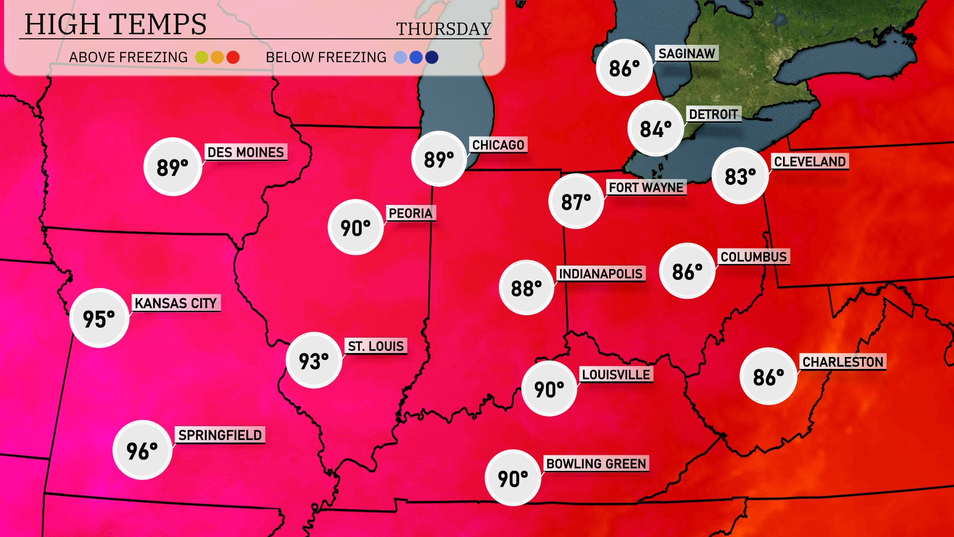 Tomorrow, Kansas City will see a high of 95 degrees, while St. Louis reaches up to 93. Peoria will be warm at 90 degrees, and Indianapolis can expect a high of 88. In the northern part of the region, Chicago and Des Moines will experience highs of 89 degrees.