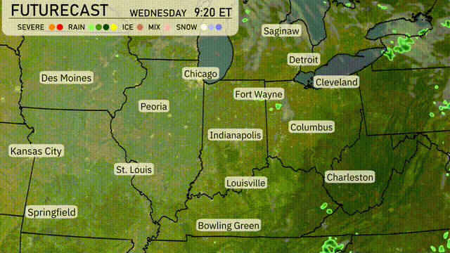 A low-pressure system moves across the Midwest, bringing widespread showers and thunderstorms, particularly from Des Moines to Fort Wayne, through Wednesday evening. Expect localized heavy rainfall in Indianapolis and Columbus, which could lead to minor flooding in low-lying areas. Temperatures range from the mid-70s in Chicago to the low 80s further south in cities like St. Louis and Louisville, with a cooler and drier air mass arriving by Thursday. A cold front pushes through boosting winds and causing some instability, which might trigger isolated severe storms specifically in areas like Fort Wayne and Peoria.