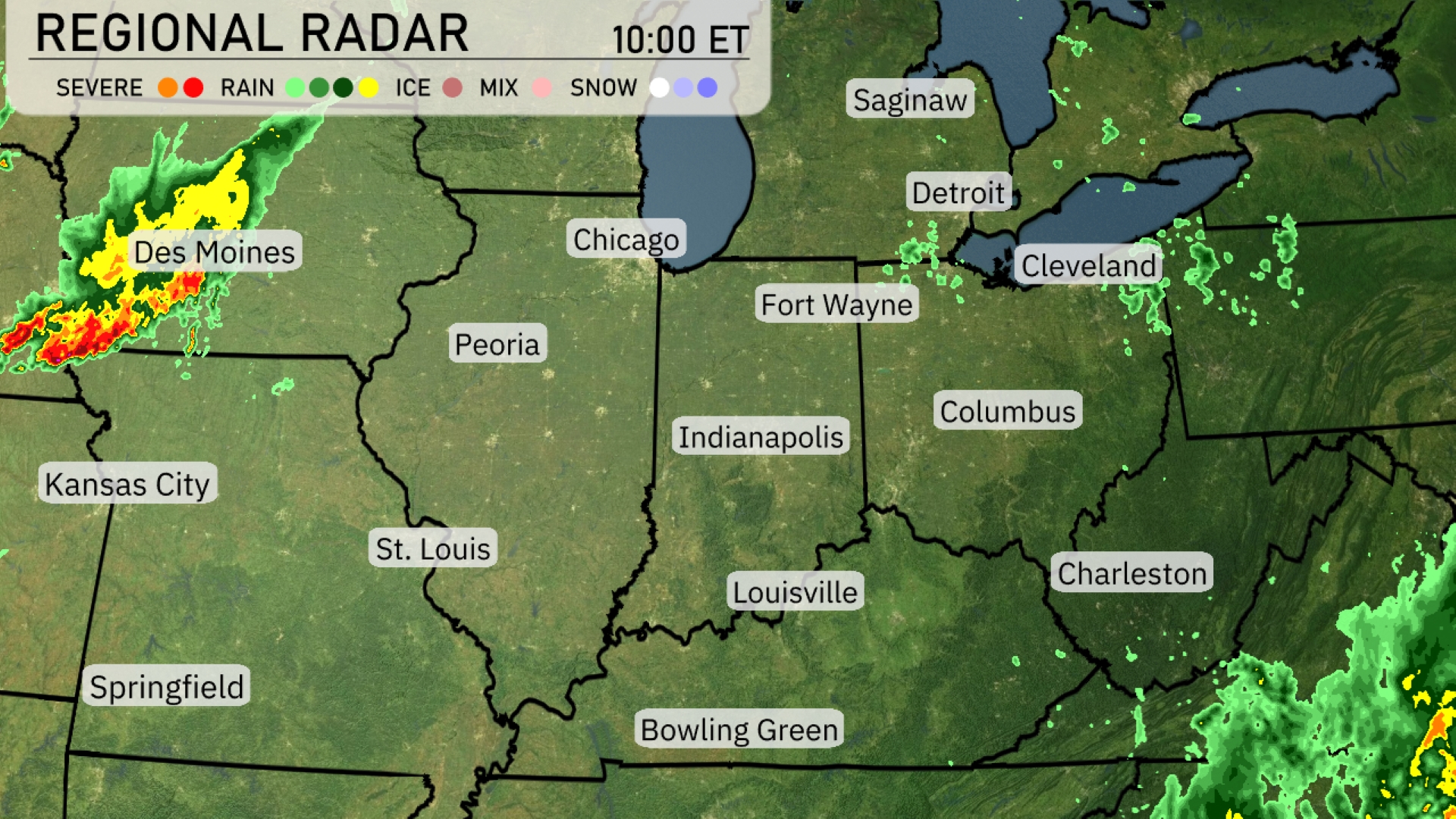 Strong thunderstorms are developing near Des Moines, moving eastward into central Iowa, indicating a wet afternoon ahead for the region. Rain showers are scattered across Cleveland, bringing some moisture that extends toward Detroit. Peoria and Indianapolis remain under cloudy conditions with minimal precipitation expected for now. Bowling Green is experiencing clear skies with no immediate weather threats.