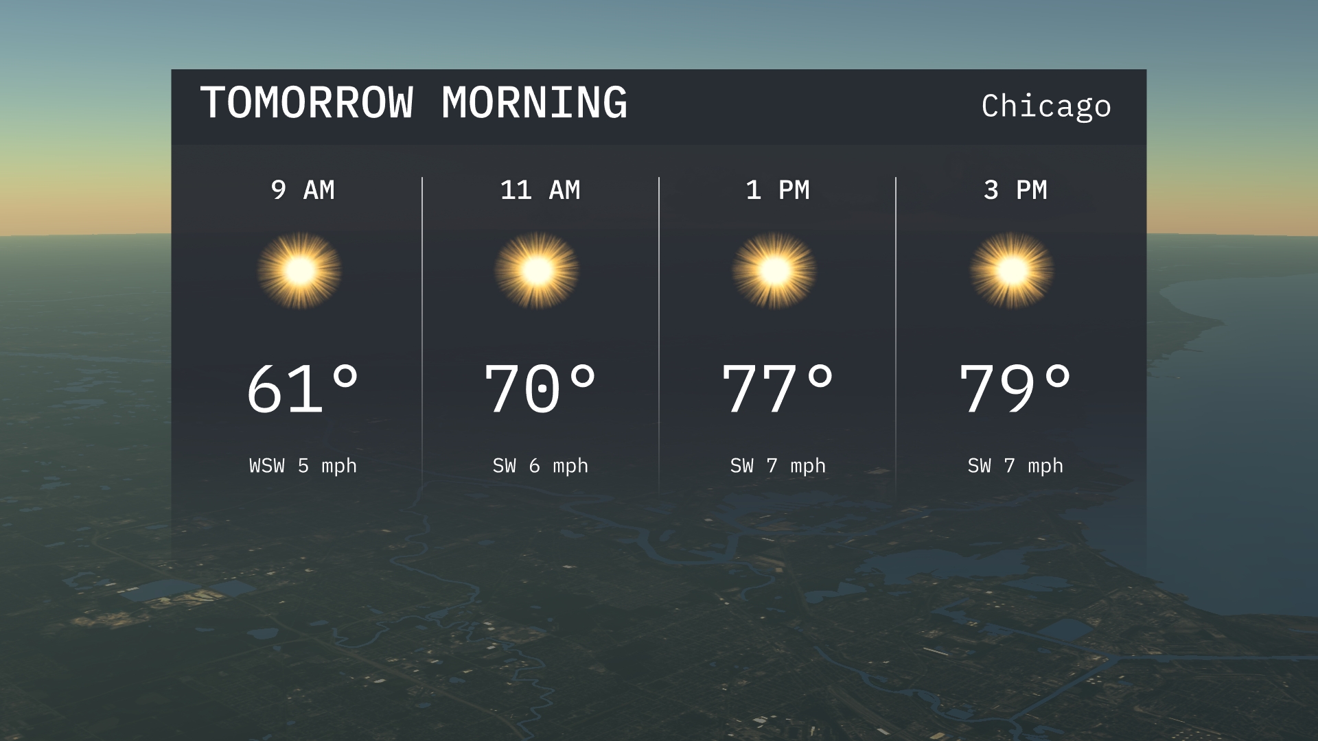 In Chicago tomorrow morning, temperatures start at 61 degrees by 9 AM, warming up to 70 degrees at 11 AM. Expect clear skies with abundant sunshine throughout the morning. Winds will be coming from the west-southwest, ranging from 5 to 6 mph, providing a gentle morning breeze.