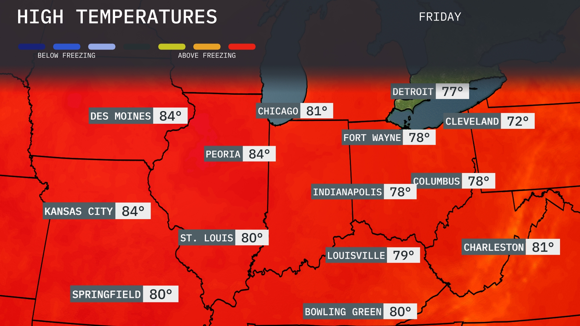 Tomorrow in the Midwest, we’re seeing warm temperatures as summer-like conditions persist. Des Moines and Peoria both reach highs of 84 degrees, while Kansas City aligns with these readings. Chicago is slightly cooler at 81 degrees. To the southeast, Indianapolis and Louisville are expected to hit 78 and 79 degrees respectively. Cleveland will experience a notable drop, with a high of just 72 degrees, reflecting a shift in weather patterns.