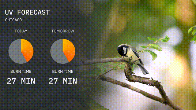 Today’s UV index in Chicago is moderate with a value of 5, suggesting a burn time of about 27 minutes. Tomorrow, similar conditions are expected with the same UV index, maintaining the same burn time. If you’re heading outside, sunscreen and protective clothing are recommended during the peak sun hours.