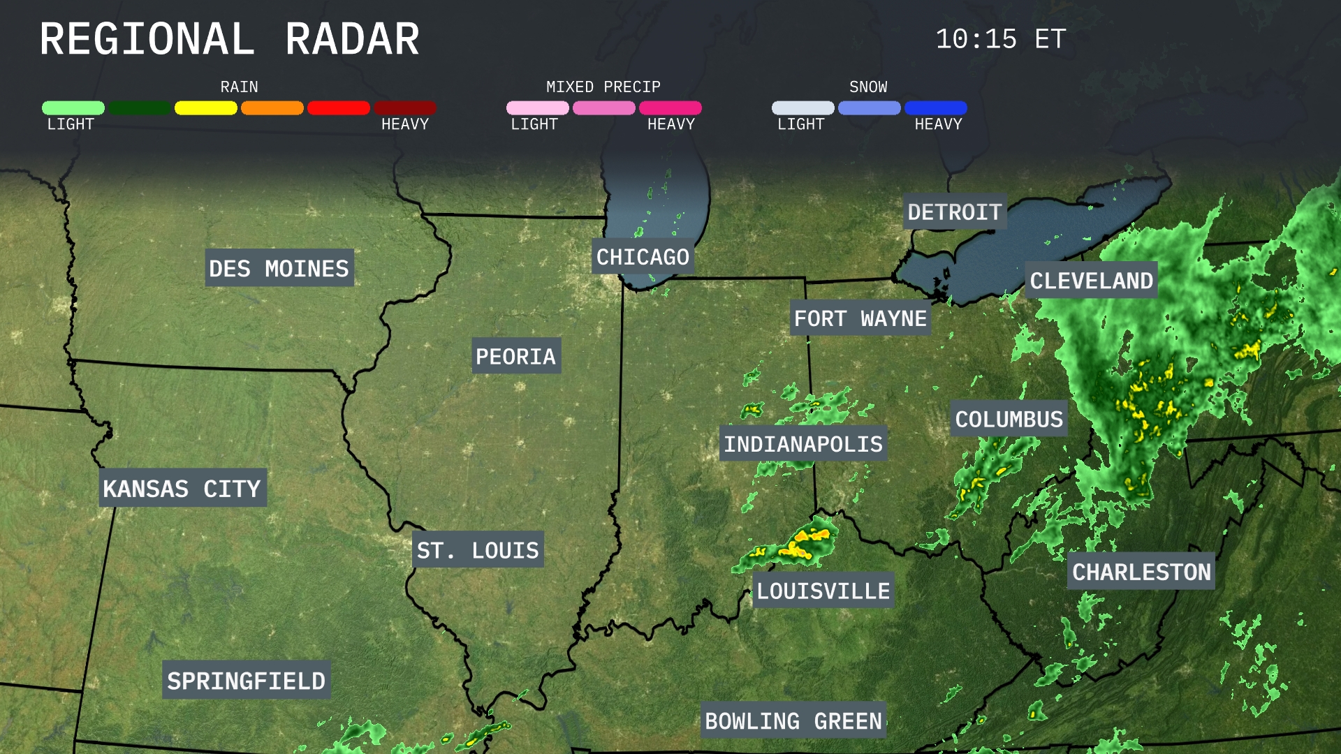 A swath of rain is sweeping across the eastern Midwest, with Cleveland experiencing steady precipitation that stretches down through Columbus reaching Charleston. Showers are developing near Indianapolis, while Louisville sees some rain as well. Areas around Peoria and Des Moines remain under clear skies. Most of the northwestern Midwest, including Kansas City and St. Louis, is presently dry with no significant cloud cover.