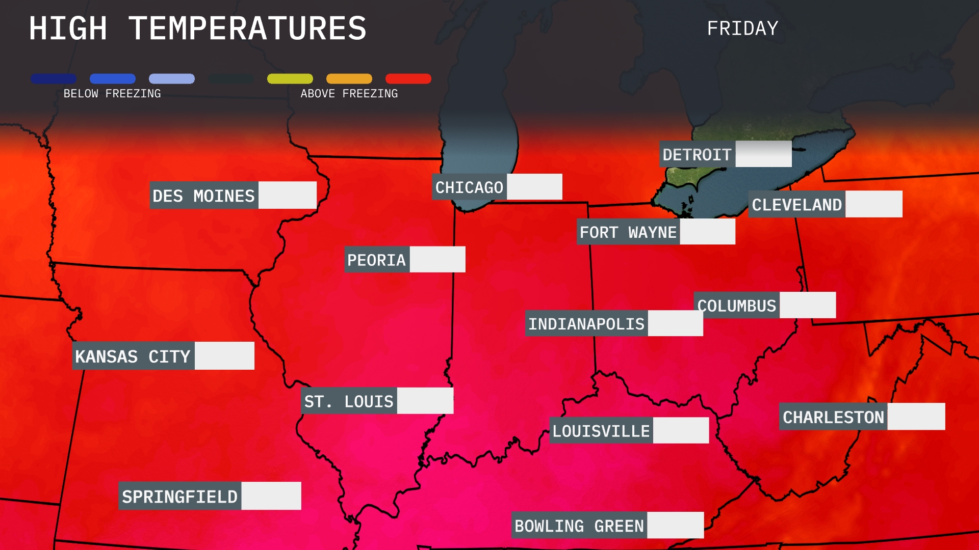 A cold front will approach the Midwest from the west, bringing storms through Kansas City and Springfield into St. Louis by Friday evening. Expect heavy rain and potential severe weather impacts, including gusty winds and isolated thunderstorm activity. Des Moines will also see some weather action, with showers spreading eastward across the region overnight. Temperatures remain warm ahead of the front, but cooler air will follow in the aftermath, noticeable by Saturday.