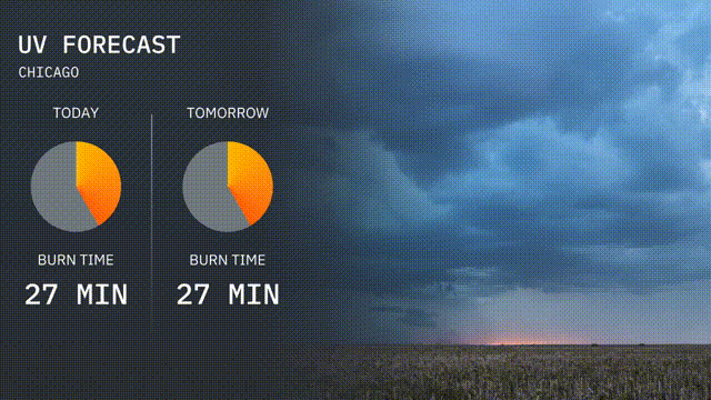 In Chicago, today’s UV index is moderate at 5, with an expected burn time of 27 minutes when under direct sunlight. Tomorrow’s index remains moderate, also at 5, indicating a similar burn time of 27 minutes.