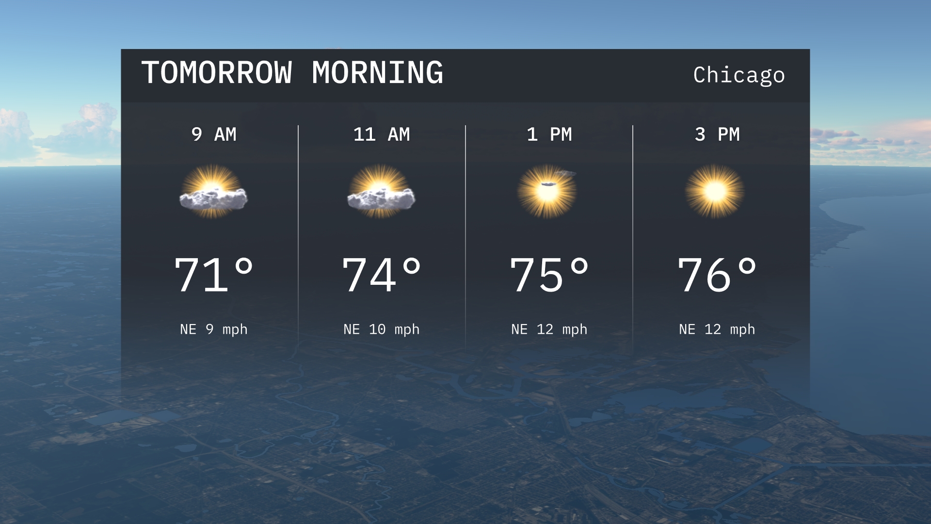 In Chicago tomorrow morning, temperatures will start at 71 degrees and rise to 74 degrees by 11 AM under partly cloudy skies. Expect a northeast wind, adding a gentle breeze to the morning. The sun will peek through more by late morning as cloud cover decreases, with a temperature climbing to 75 degrees by 1 PM.
