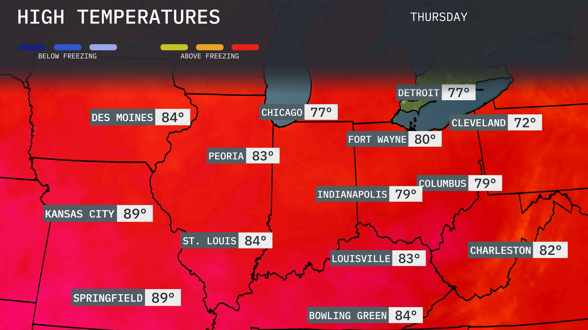 Tomorrow in the Midwest, Kansas City and Springfield will be sizzling with highs reaching 89 degrees, significantly above average for this time of year. St. Louis will also warm up to 84 degrees, while Peoria and Louisville will hit 83 and 84 degrees, respectively. In contrast, Chicago will be cooler at 77 degrees, along with Detroit and Cleveland, also both reaching 77 and 72 degrees. A warm front is influencing these above-average temperatures, bringing unseasonably warm air across the region.