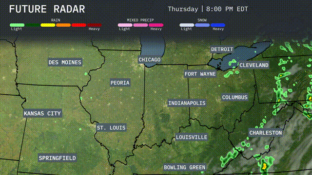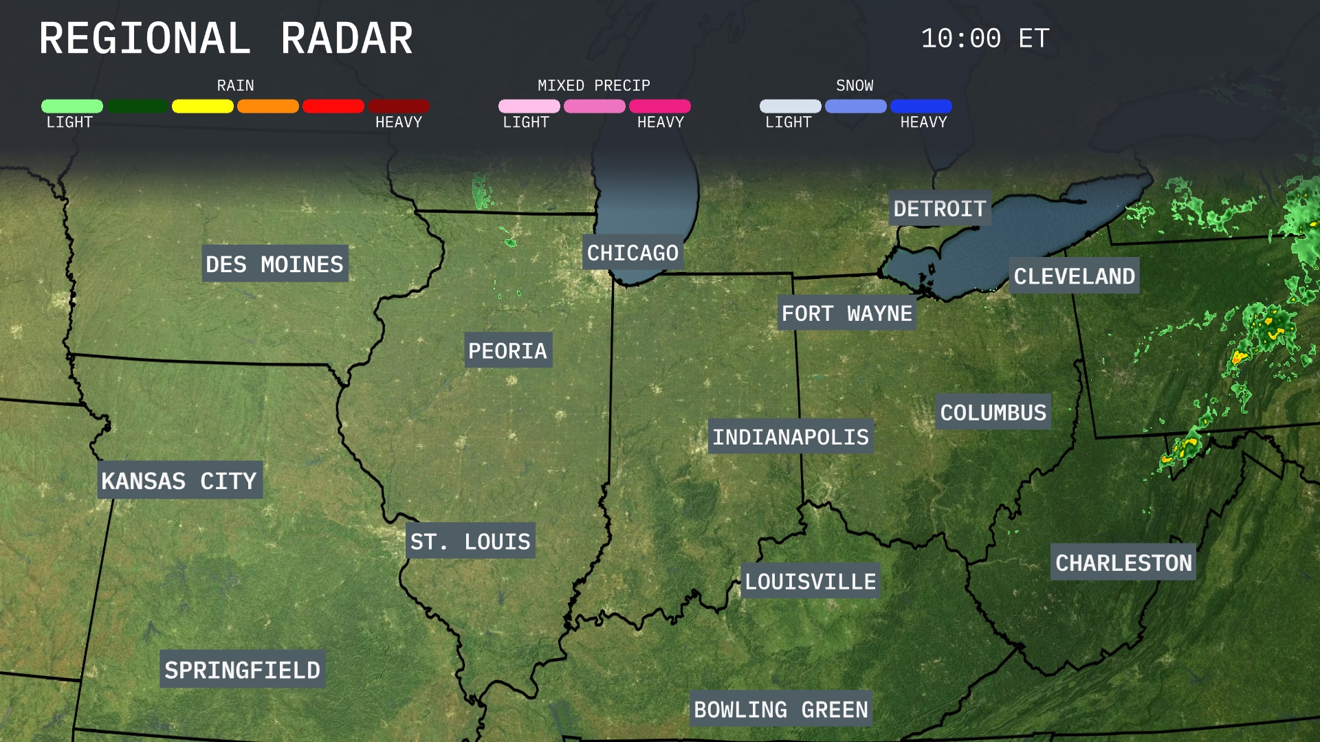 The Midwest regional radar is relatively quiet today, with only a few areas of activity. Light rain showers are seen moving towards Detroit, while heavier showers are building just north of Cleveland. The area around Chicago remains under clear conditions. Indianapolis and Fort Wayne are currently experiencing cloudy skies with no precipitation, and down in St. Louis, there are clear skies offering a break from any stormy weather.