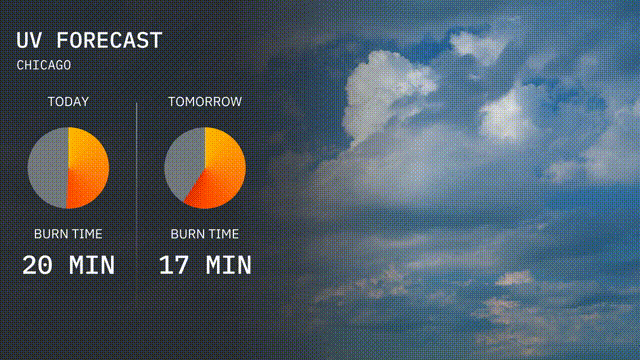 Chicago’s UV index today is moderate with a value of 5, implying a burn time of about 20 minutes in direct sunlight. Tomorrow, expect the UV index to dip slightly to 4, with a burn time of 17 minutes. Make sure to have sun protection handy!