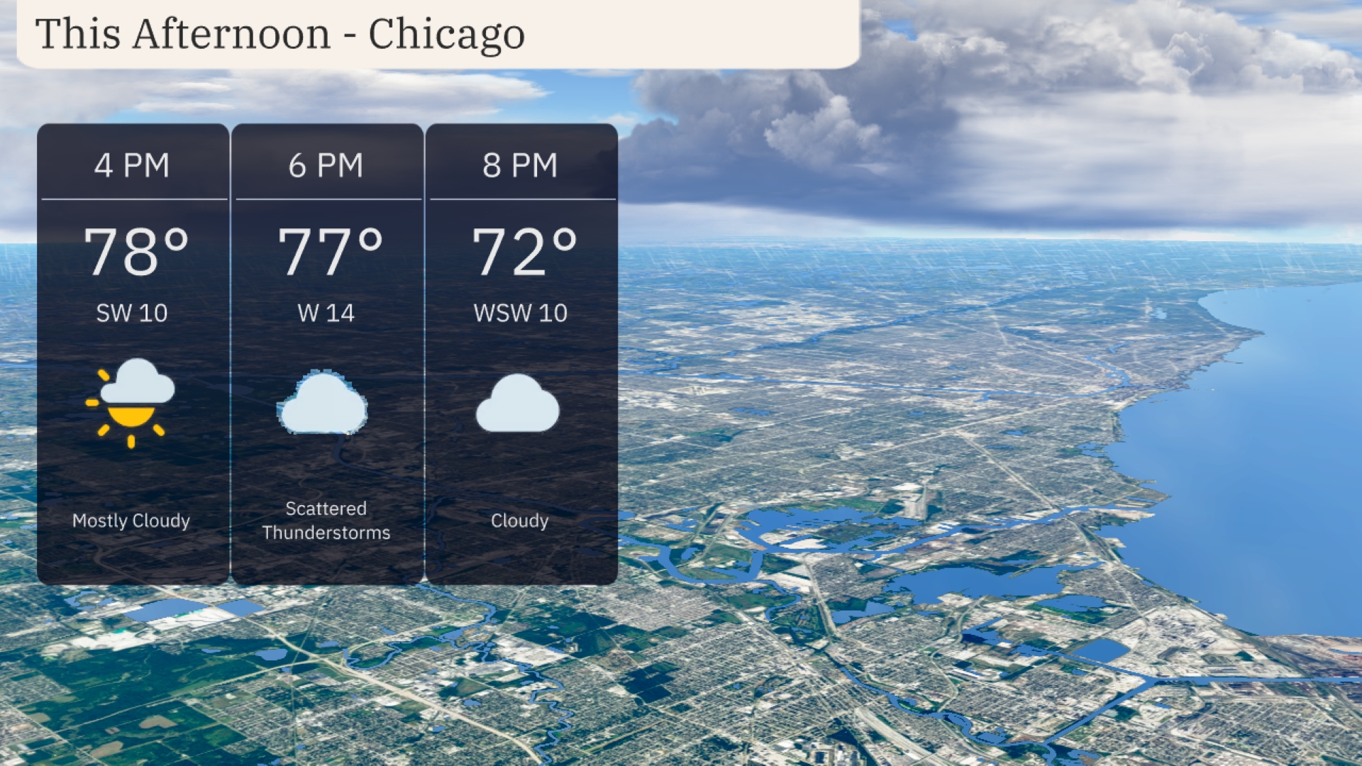 Chicago’s afternoon brings a warm mix of sun and clouds with temperatures climbing to 78 degrees. Be prepared for a shift as scattered thunderstorms develop by 6 PM, dropping the temperature slightly to 77 degrees with winds from the west at 14 miles per hour. As we move into the evening, expect the skies to become mostly cloudy, with temperatures decreasing to 72 degrees and winds shifting to the west-southwest at 10 miles per hour.