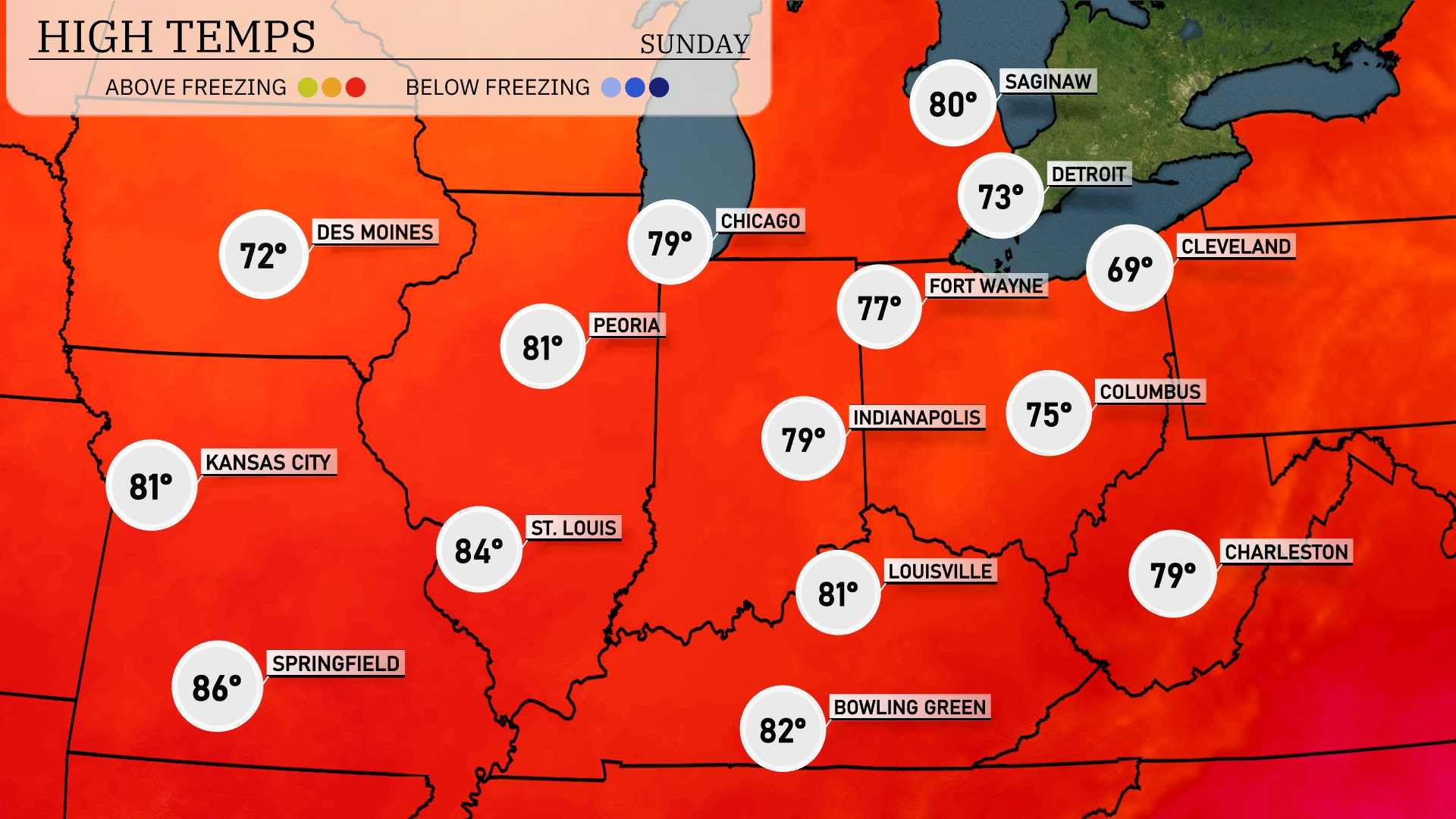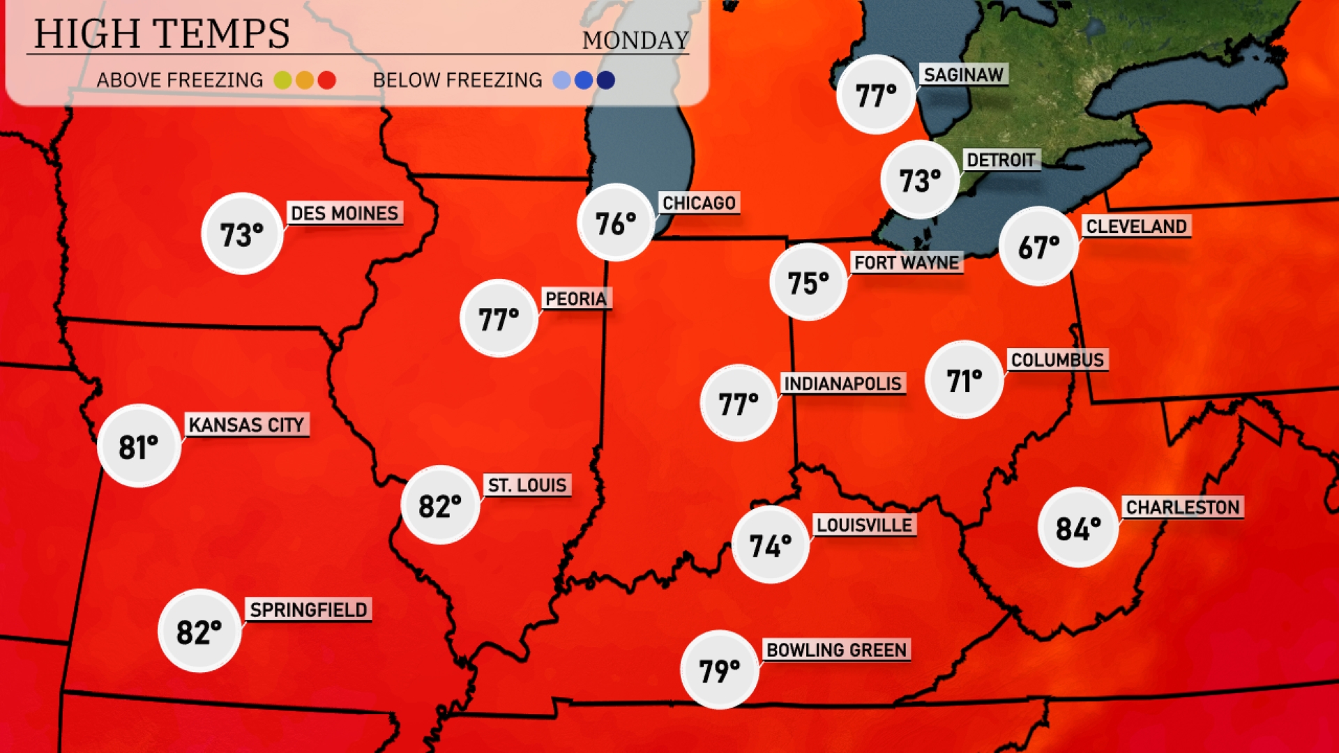 Tomorrow, Kansas City is looking at a high of 81 degrees, while St. Louis will reach 82. In Chicagoland, expect a comfortable 76, with nearby Peoria slightly warmer at 77. Indianapolis will see a high of 77, and Louisville will hit 74. Cleveland lags behind with a cooler 67, reflecting below-average temperatures for this time of year, while Charleston tops the charts at 84 degrees, indicating a notable warm front influencing the region.