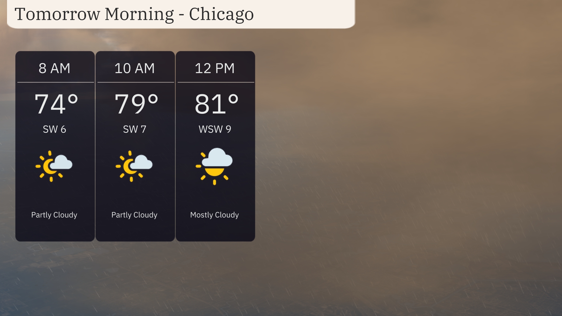 Tomorrow morning in Chicago, you’ll experience a warm start with temperatures at 74 degrees at 8 AM. Skies remain partly cloudy with a southwest wind blowing at 6 miles per hour. By 10 AM, the temperature rises slightly to 79 degrees as the southwesterly breeze continues. Prepare for mostly cloudy skies by noon with temperatures reaching 81 degrees and winds shifting to west-southwest at 9 miles per hour.