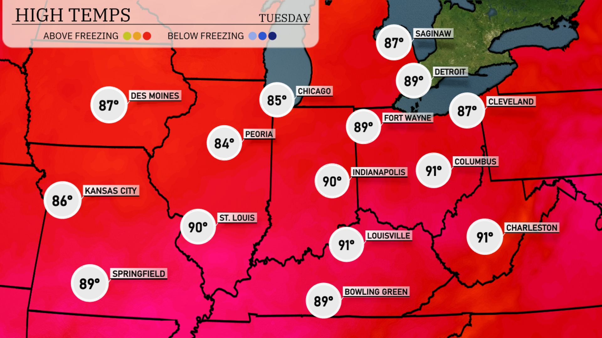 Tomorrow in the Midwest, temperatures are set to soar, with highs reaching 91 degrees in both Louisville and Indianapolis. Chicago will warm up to 85 degrees, while nearby Fort Wayne and Cleveland expect to see 89 degrees. Kansas City is a bit cooler at 86, though still above average for this time of year. Regions will experience a warm front that’s contributing to these above-normal readings. Expect plenty of sunshine and minimal wind to accompany these high temperatures.