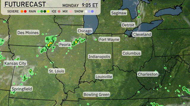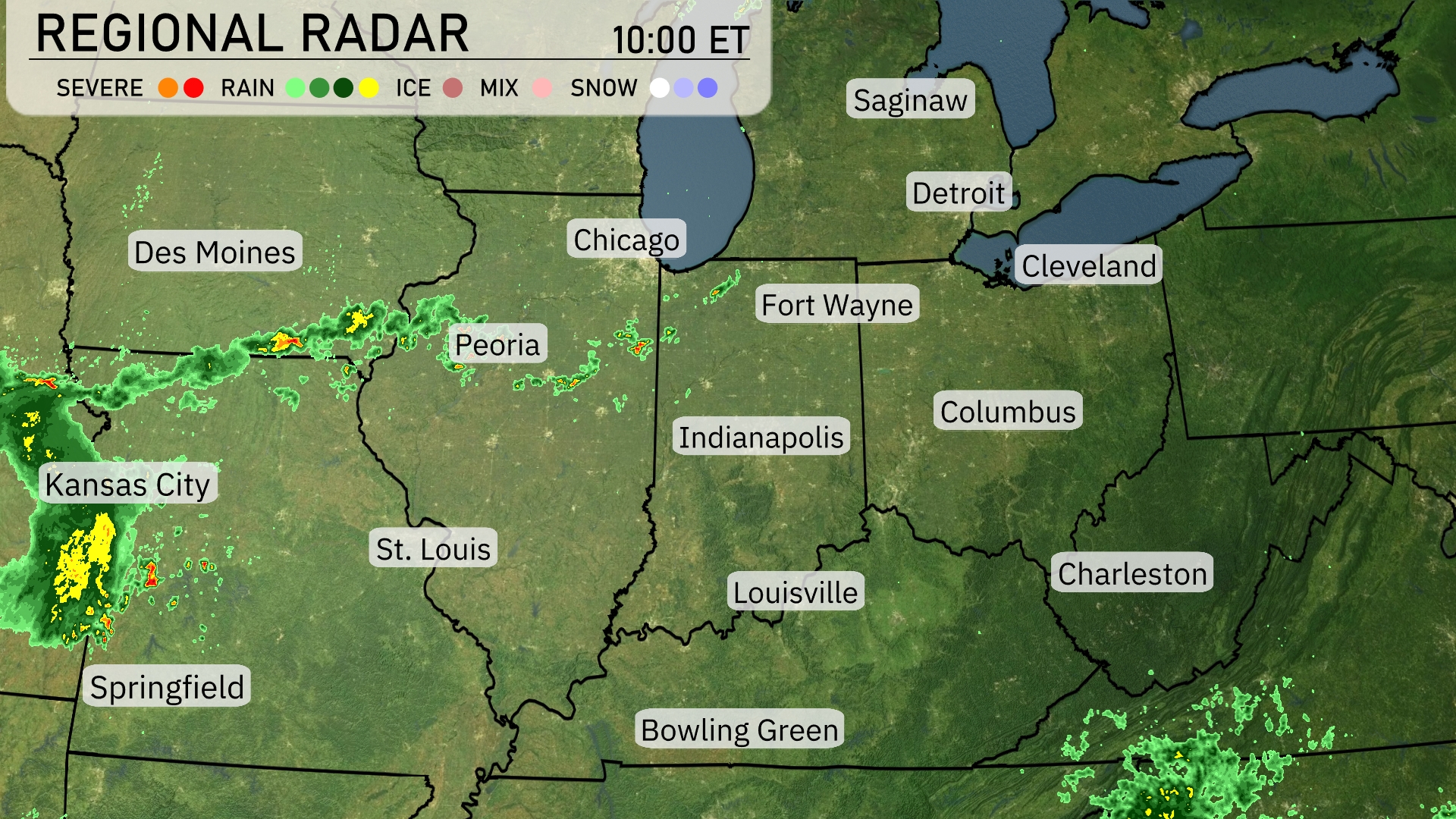 Severe storms are sweeping across the Midwest, with Kansas City currently in the thick of it as storms approach from the southwest. St. Louis is seeing rain showers pushing through, and more moderate rain is spreading toward Des Moines. Indianapolis has seen an increase in cloud cover, with rain showers developing in the vicinity. The Southeast corner of Ohio is experiencing scattered light rain showers, stretching towards Charleston.