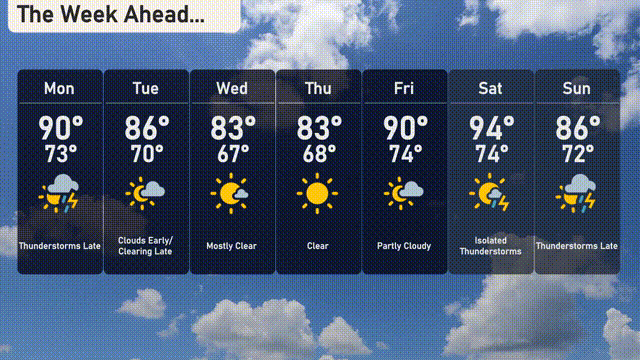 For the 7-day forecast in Chicago: Monday: Thunderstorms are expected late, with a high of 90 degrees and a low of 73 degrees. Tuesday: Clouds linger early but clear later in the day. Expect a high of 86 degrees and a low of 70 degrees. Wednesday: Mostly clear skies with a pleasant high of 83 degrees and a low of 67 degrees. Thursday: Clear conditions continue with another high of 83 degrees and a low of 68 degrees. Friday: Partly cloudy skies with temperatures peaking at 90 degrees and a low of 74 degrees. Saturday: Isolated thunderstorms might make an appearance, with a high of 94 degrees and a low of 74 degrees. Sunday: Thunderstorms could develop late in the day, with a high of 86 degrees and a low of 72 degrees.