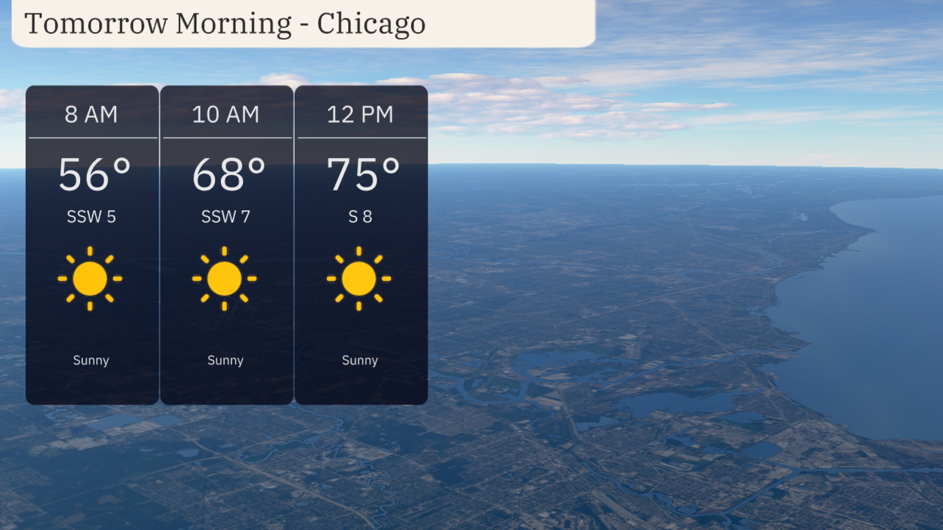 Tomorrow morning in Chicago, expect a sunny start with temperatures rising from 56 degrees at 8 AM to 68 degrees by 10 AM. Winds will be gently blowing from the south-southwest at 5 to 7 miles per hour, offering a pleasant breeze.