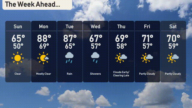 Here’s the 7-day forecast for Chicago: Sunday: Clear skies with a high of 65 degrees and a low of 50 degrees. Monday: Mostly clear, warming up to 88 degrees, with a low of 69 degrees. Tuesday: Rain is expected with a high of 87 degrees and a low of 65 degrees. Wednesday: Showers continue with temperatures reaching 67 degrees during the day and cooling to 57 degrees at night. Thursday: Clouds linger early, clearing up later with a high of 69 degrees and a low of 58 degrees. Friday: Partly cloudy conditions prevail, with a high of 71 degrees and a low of 57 degrees. Saturday: Partly cloudy skies with a high of 70 degrees and a low of 59 degrees.