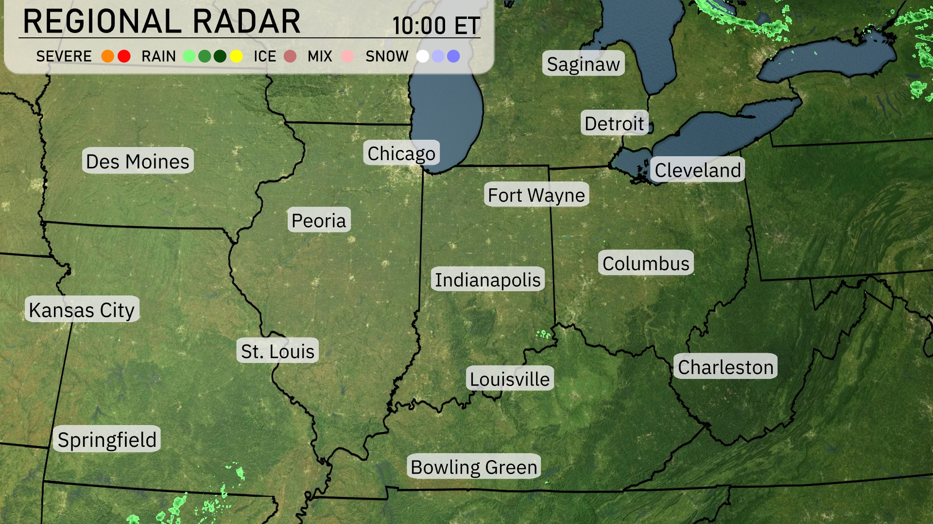 On the Regional Radar, scattered rain showers are spotted near Bowling Green and east of Indianapolis, drifting northeast. In parts of northeastern Indiana, Fort Wayne can expect some light precipitation today. Meanwhile, clear skies dominate much of the Midwest, including Chicago, Des Moines, and St. Louis. In southern Missouri, a few isolated showers are developing, but they remain widely scattered.