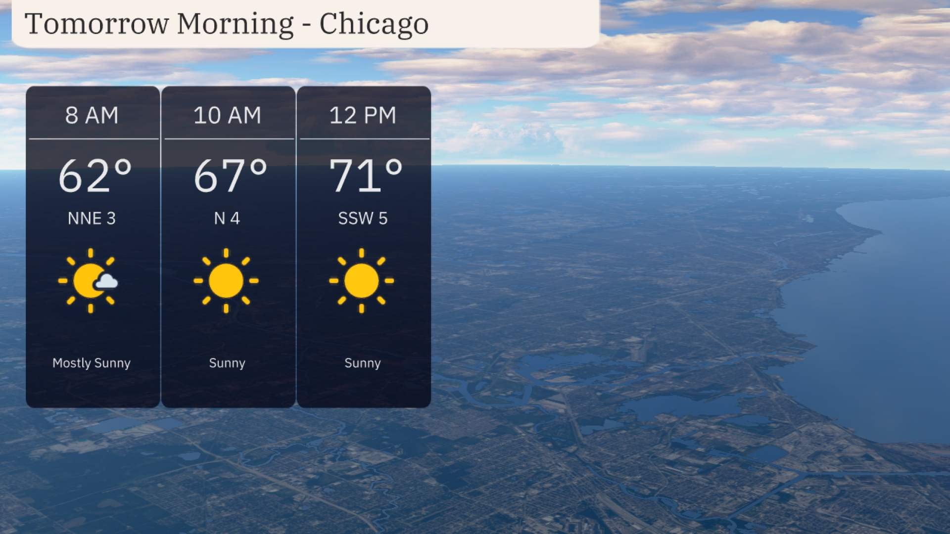 The forecast for tomorrow morning in Chicago shows mostly sunny skies transitioning to clear conditions. Temperatures will rise from 62 degrees at 8 a.m. to 71 degrees by noon. Winds will shift from a light northeast breeze at 3 miles per hour to a southerly flow at 5 miles per hour by midday.