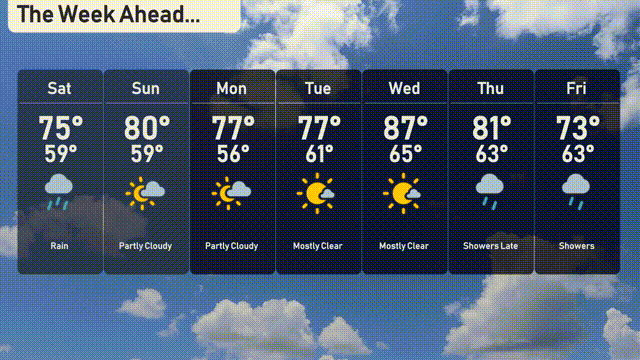 Saturday: Rain is expected with a high of 75 degrees and a low of 59 degrees.