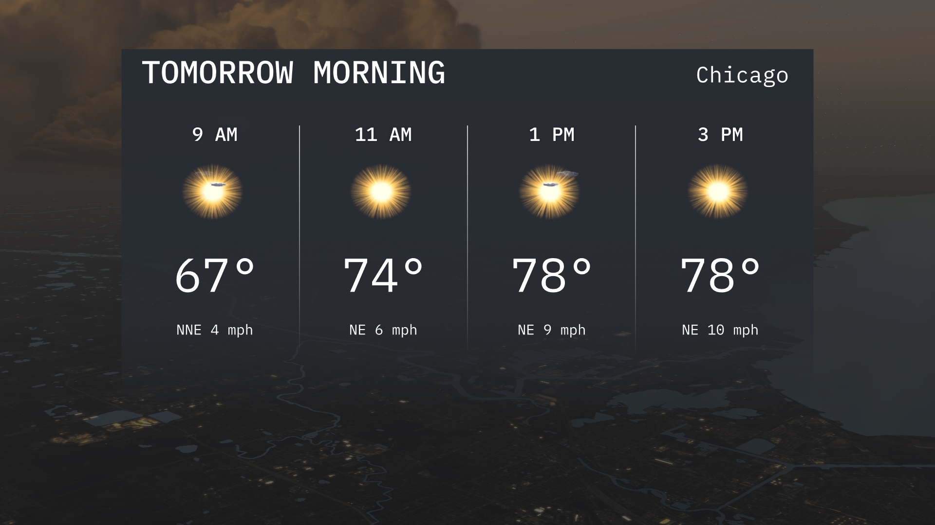 Chicago will experience a bright and sunny start to the day with temperatures rising steadily from 67 degrees at 9 AM to a comfortable 74 degrees by 11 AM. Expect a gentle breeze coming from the northeast at 4 to 6 miles per hour, which should provide a pleasant feel in the air. It’s a perfect morning to enjoy some outdoor activities as the weather remains clear and calm.