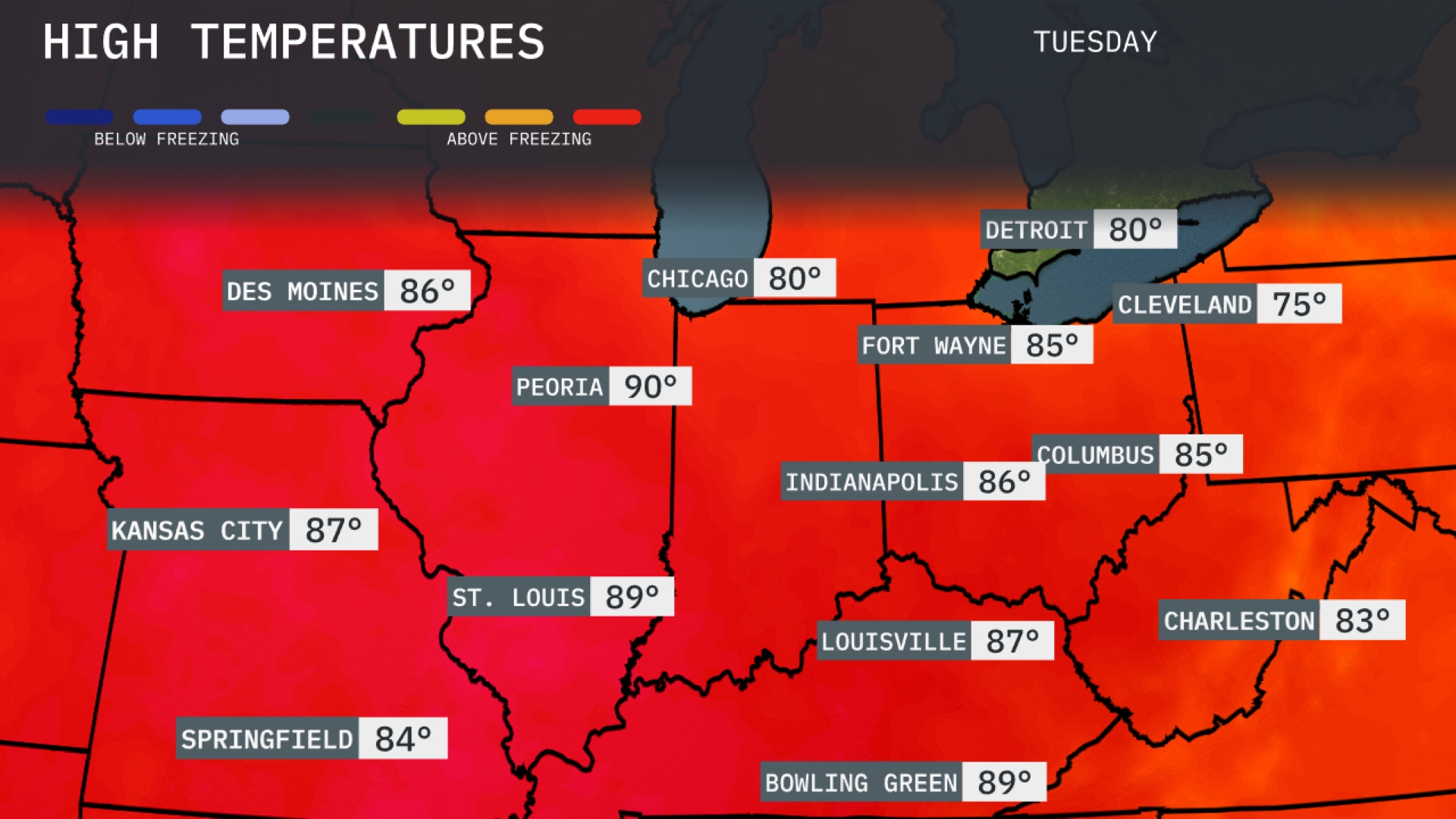 Tomorrow in Peoria, expect a sizzling high of 90 degrees, while St. Louis will come in close with 89 degrees. Kansas City is also warm at 87 degrees, and Indianapolis reaches 86 degrees. Chicago will see a comfortable high of 80 degrees. Overall, the Midwest is experiencing above-average temperatures this time of year due to a persistent warmth in the atmosphere.