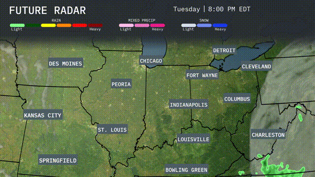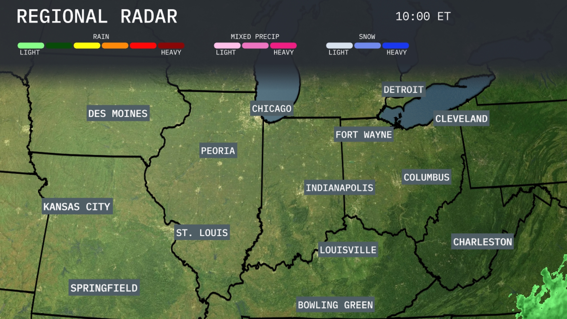 A storm system is moving into the Midwest, with heavy rainfall indicated over eastern portions of the region, particularly near Indianapolis and extending eastward toward Columbus. Light rain is also creeping into areas around Fort Wayne and Detroit, suggesting an active weather pattern. Chicago and surrounding areas like Peoria appear to be experiencing clearer skies, providing a respite from the stormy conditions.