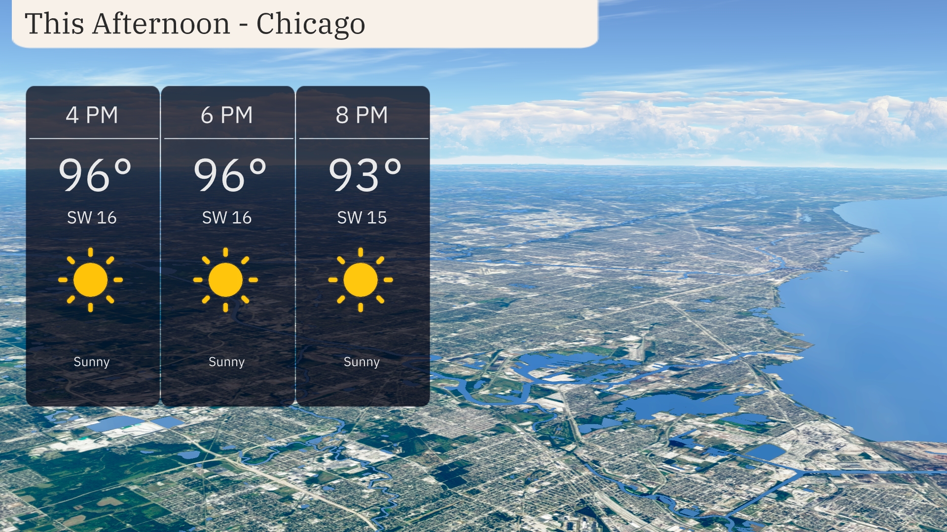 In Chicago this afternoon, temperatures will stay steady at 96 degrees with sunny skies. There is a southwest wind at 16 miles per hour, offering a bit of a breeze to cool things down. By 8 PM, the temperature will slightly drop to 93 degrees, with winds easing to 15 miles per hour. Overall, it’s a bright and warm afternoon with consistent sunshine.