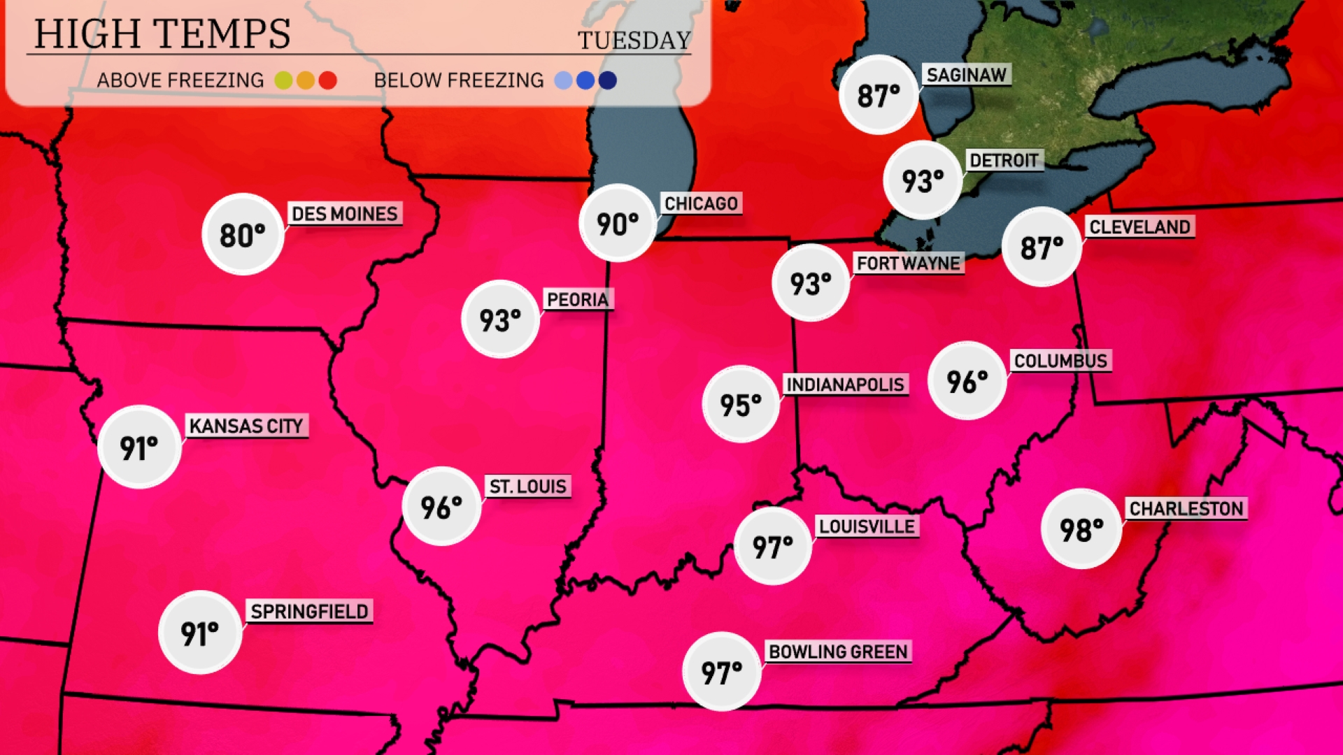 Tomorrow in the Midwest, temperatures will soar with St. Louis peaking at 96 degrees. Kansas City and Springfield are expected to hit 91 degrees each, while Chicago sees a high of 90. Indianapolis will reach 95 degrees, and Louisville climbs to a steamy 97 degrees. Notably, Charleston, West Virginia, looks to be one of the hottest spots in the region at 98 degrees, well above average for this time of year.