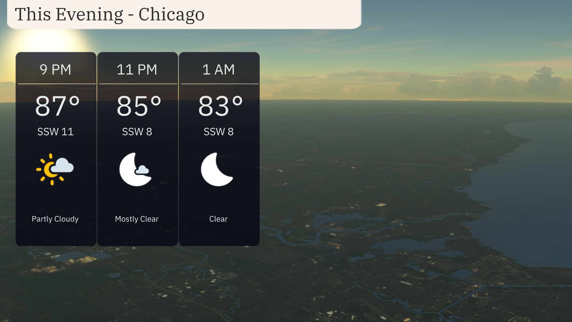 This evening in Chicago, expect partly cloudy skies at 9 PM with temperatures around 87 degrees. Winds will be from the south-southwest at 11 miles per hour. By 11 PM, conditions become mostly clear as temperatures dip to 85 degrees with calmer winds at 8 miles per hour. Clear skies will continue at 1 AM as temperatures slightly drop further to 83 degrees.