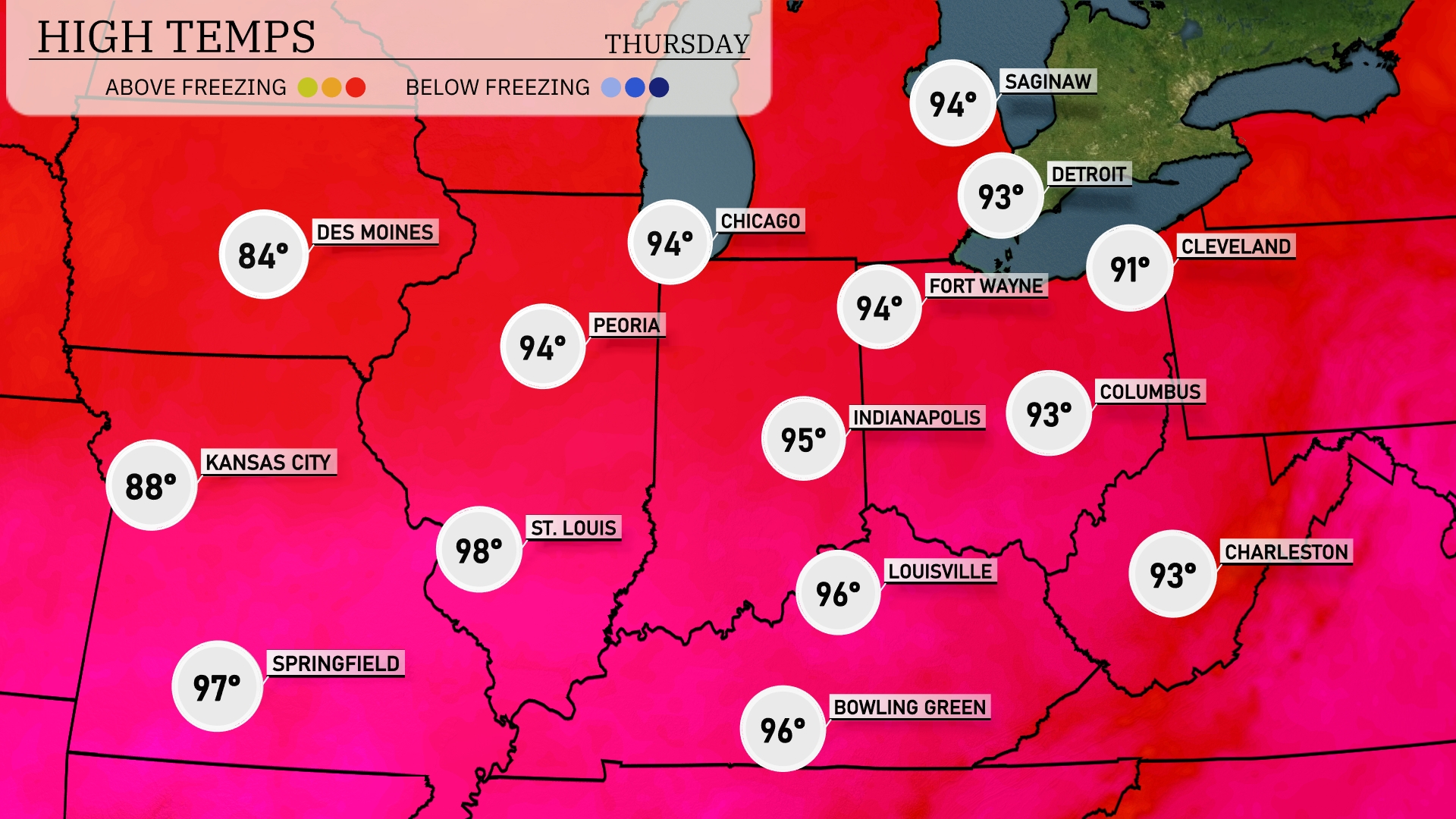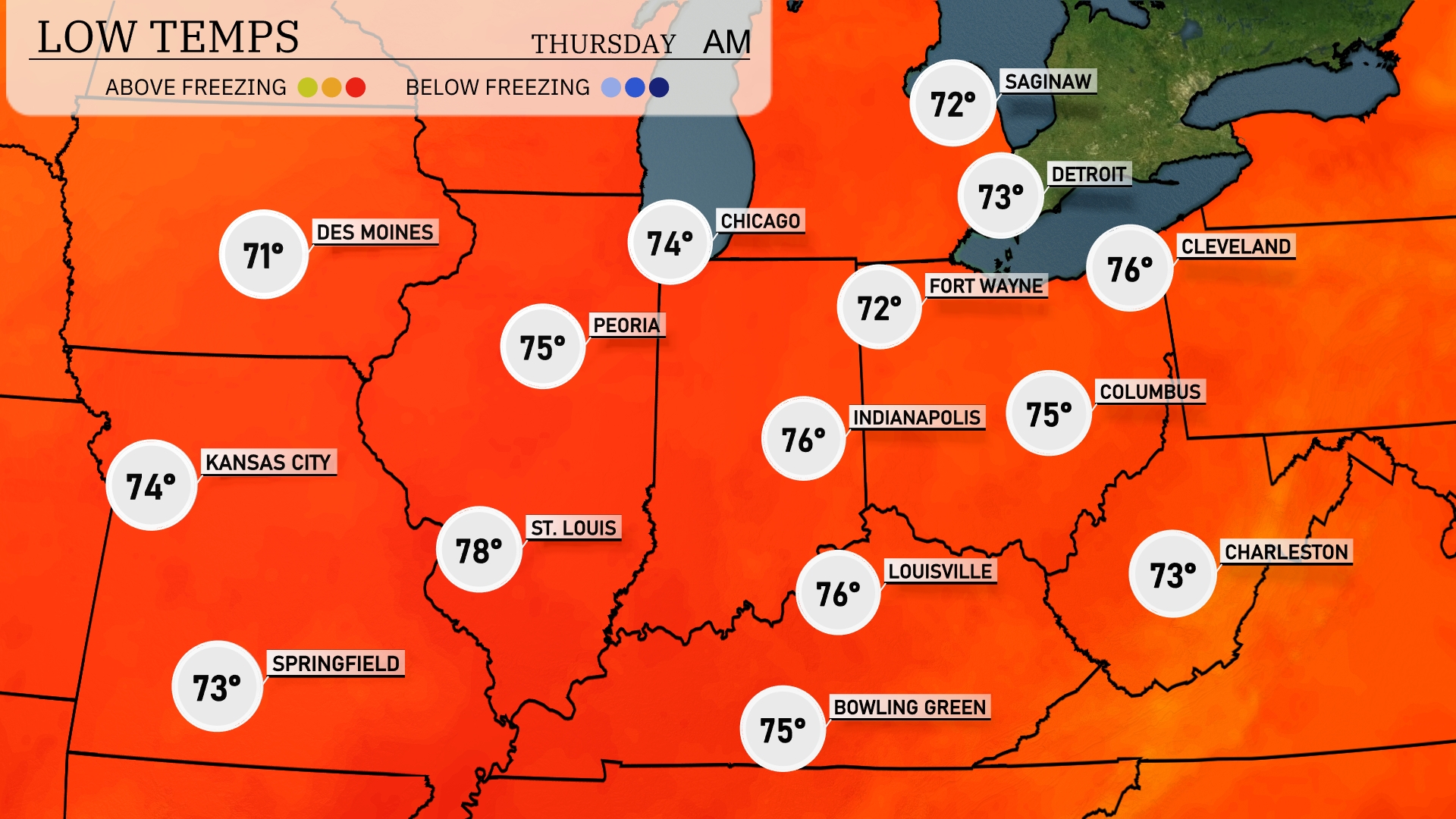 Tonight, Kansas City will see a low of 74 degrees, while Des Moines cools down to 71. Expect 75 degrees in Indianapolis and 76 in Louisville. Cleveland will drop to 76 degrees, and Chicago will have a comfortable low of 74.