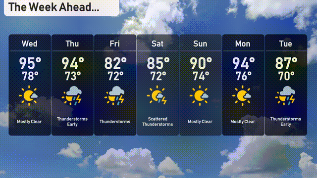 Wednesday: Expect mostly clear skies with a high of 95 degrees, dipping to 78 degrees at night.