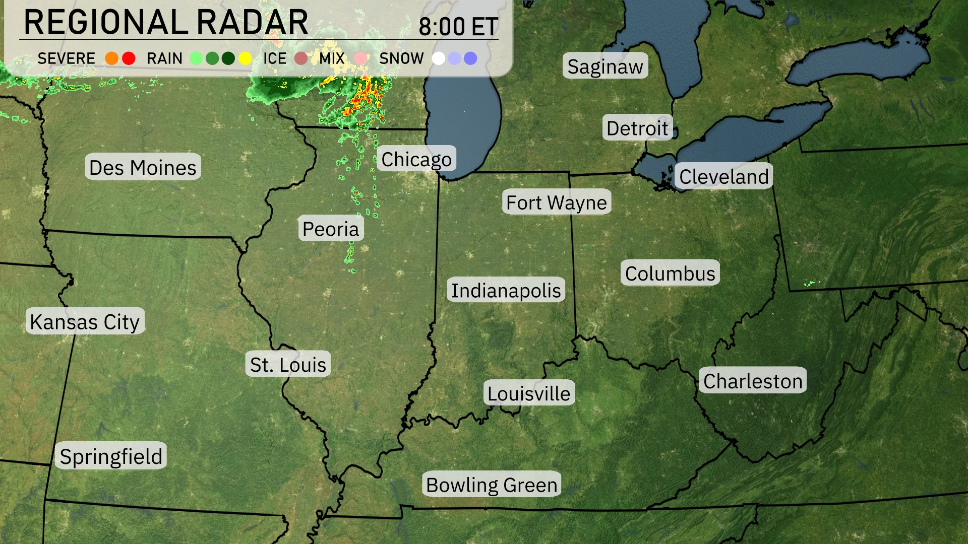 A cluster of severe storms is sweeping over northern Illinois, with heavy rainfall moving across areas like Chicago and Peoria. Parts of eastern Iowa, including Des Moines, are experiencing light rain showers pushing eastward. Meanwhile, Indianapolis and Fort Wayne are enjoying clear skies as the rain lingers west of the region. The Ohio Valley, covering areas like Cleveland and Detroit, remains tranquil with no immediate signs of precipitation.