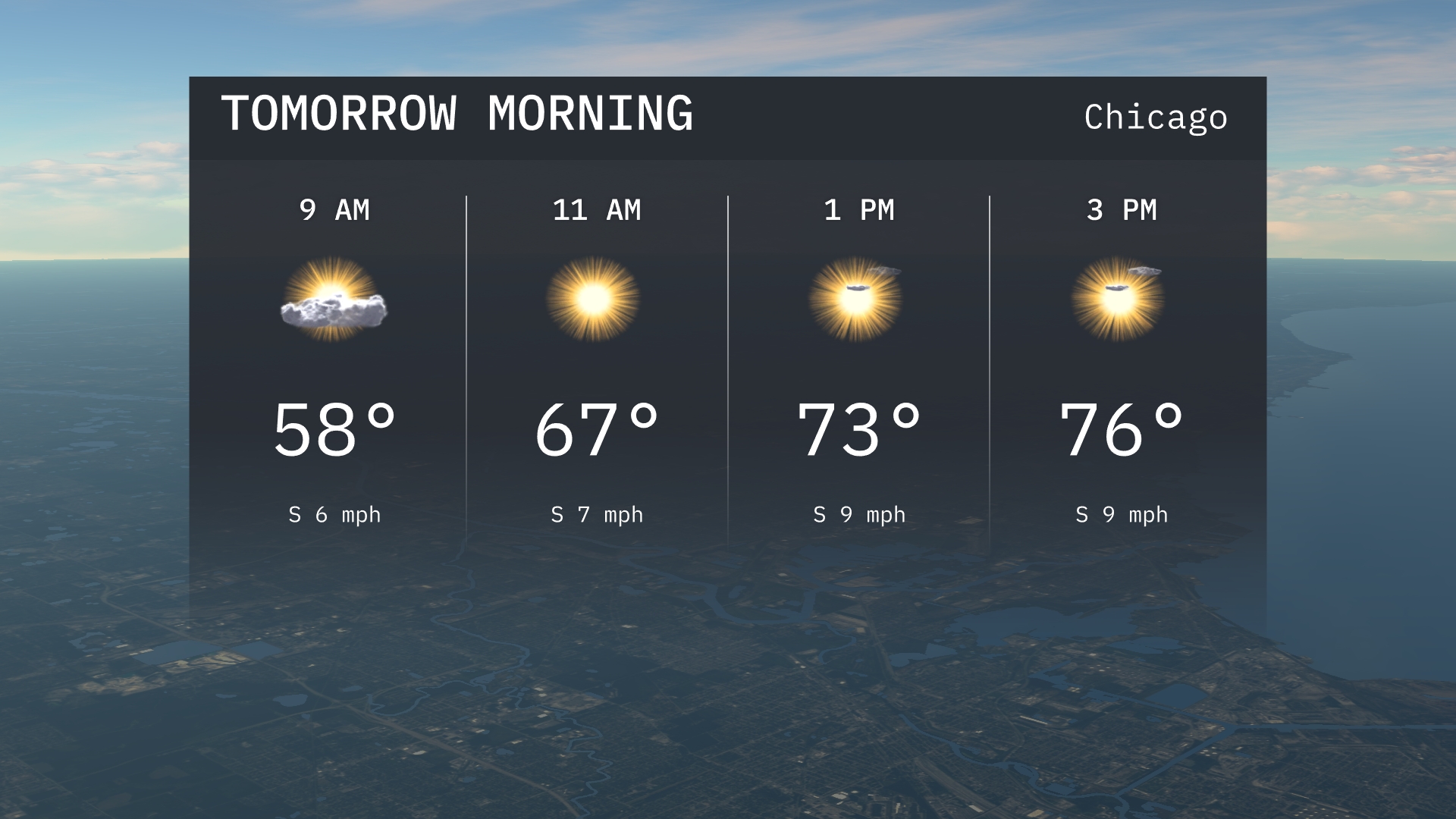 Chicago will experience a sunny morning tomorrow, with temperatures starting at 58 degrees at 9 AM and rising to 67 degrees by 11 AM. Expect a gentle south breeze, blowing at 6 to 7 miles per hour, as you head out for the day. The sky will clear up quickly after a slight cloud cover early on.