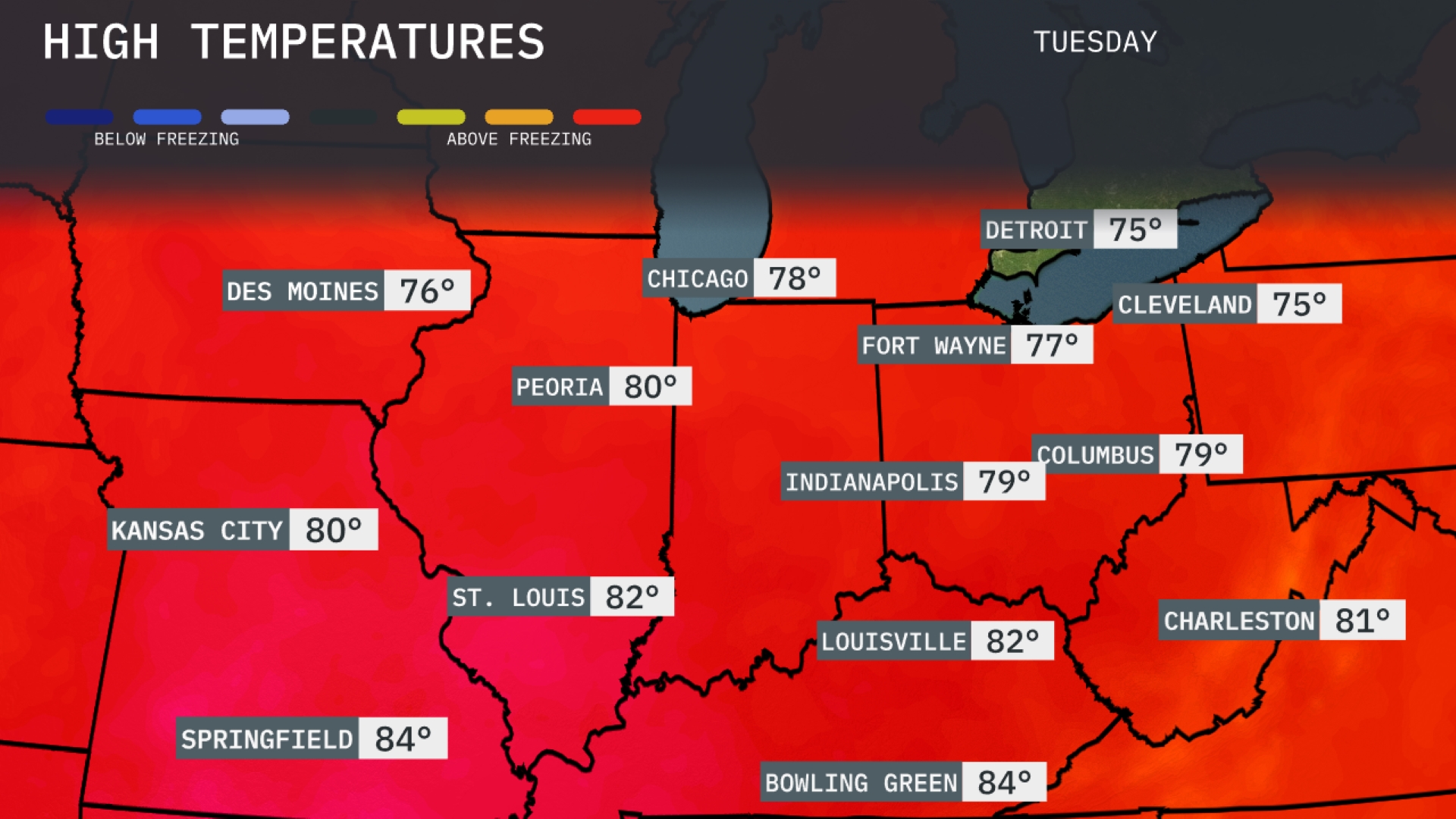 Tomorrow in the Midwest, Springfield leads the way with a high of 84 degrees, reflecting above-average temperatures for this time of year. St. Louis will see a warm 82 degrees, while Peoria and Kansas City follow closely behind at 80 degrees each. Chicago is also expected to have a pleasant day with a high of 78 degrees. Further east, Indianapolis and Columbus will reach 79 degrees, providing comfortable conditions across the region.