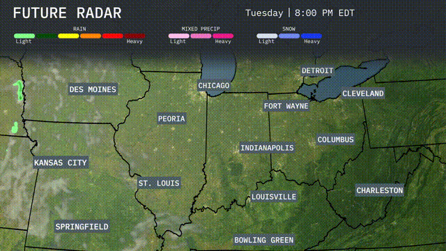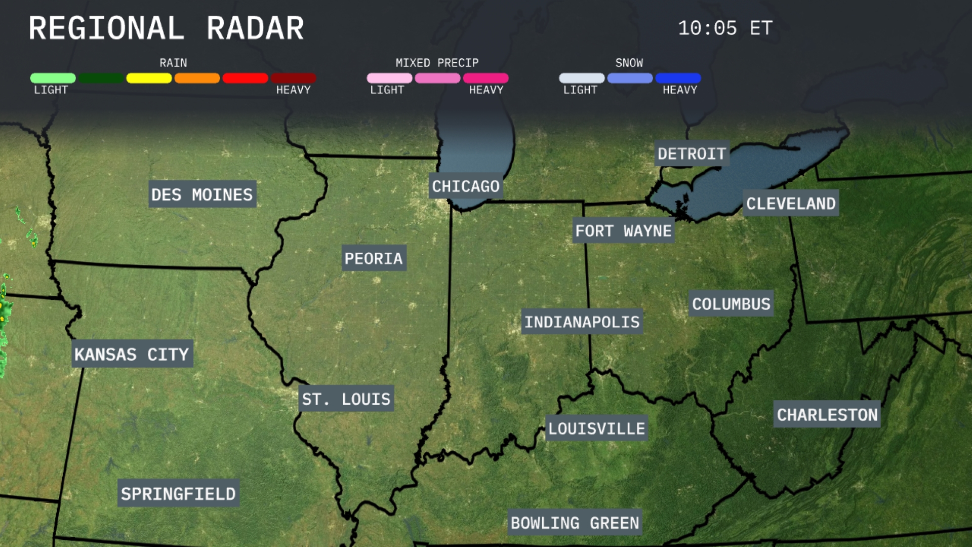 We’re monitoring a light rain shower approaching from the west, heading towards Des Moines and Kansas City. The skies over Chicago, Detroit, and Cleveland are currently clear, offering a pleasant start to the day. Indianapolis and Columbus are experiencing partly cloudy conditions, which may develop into light rain later. Meanwhile, Springfield and St. Louis are staying dry, with no immediate precipitation in the forecast.