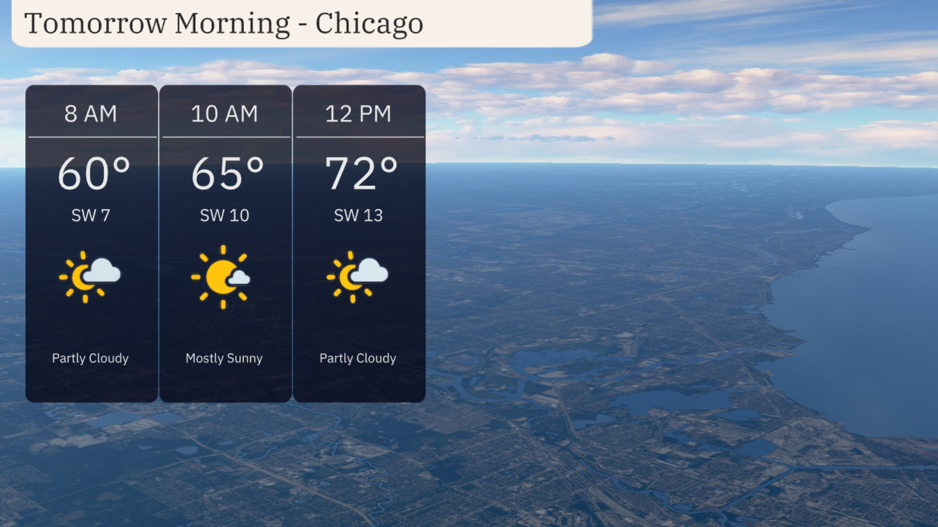 Expect a pleasant start to your morning in Chicago with temperatures rising from 60 degrees at 8 AM to 65 degrees by 10 AM. Winds will be coming in from the southwest, starting at 7 miles per hour and increasing to 10 miles per hour. You’ll enjoy mostly sunny skies with occasional cloud cover. By noon, temperatures will reach 72 degrees with winds picking up to 13 miles per hour.