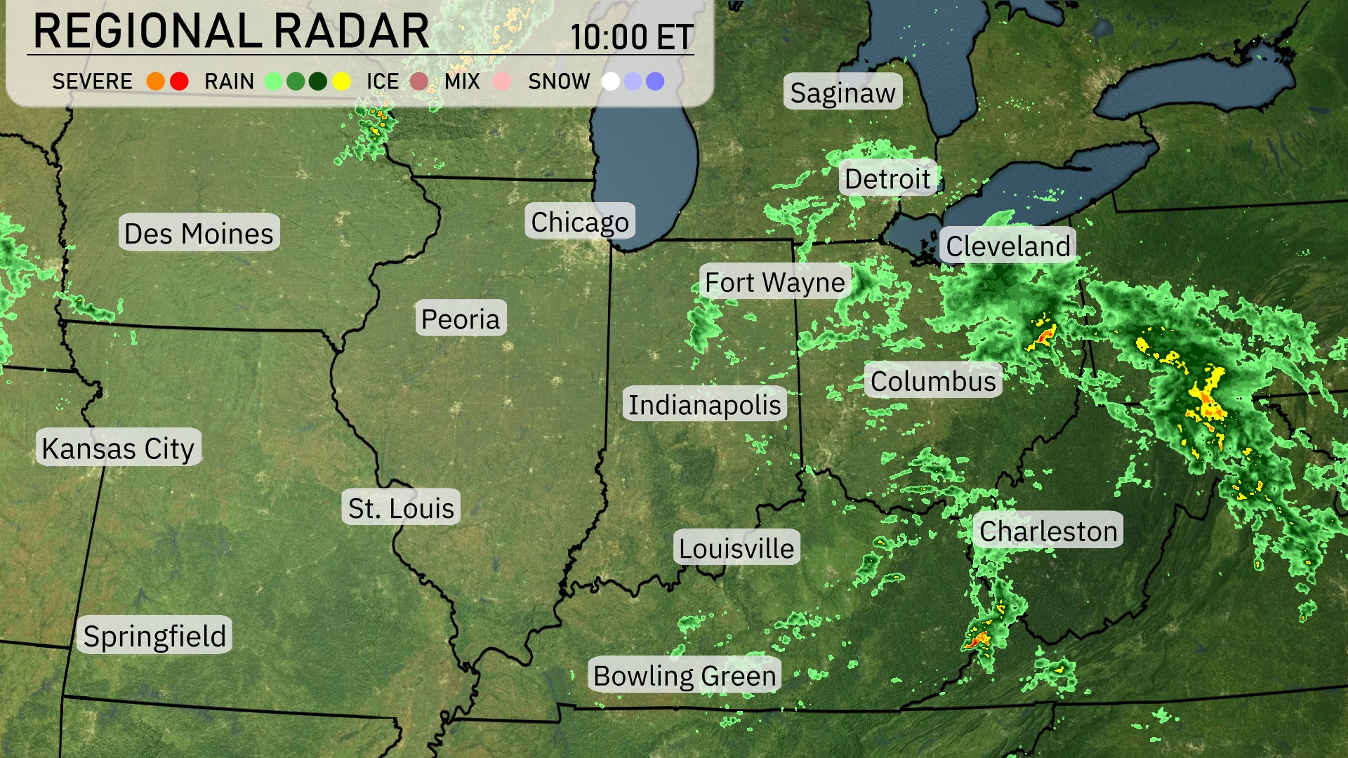 A potent system is sweeping through the Midwest, bringing impactful weather across several major areas. Saginaw and Detroit are experiencing moderate rain, expanding southeast towards Fort Wayne and pushing into Columbus with steady precipitation. Louisville is seeing a break from conditions, but clouds are dominating the skyline across the Ohio Valley. Areas like St. Louis and Des Moines are enjoying clearer conditions, providing a pleasant start to the day in these locales.