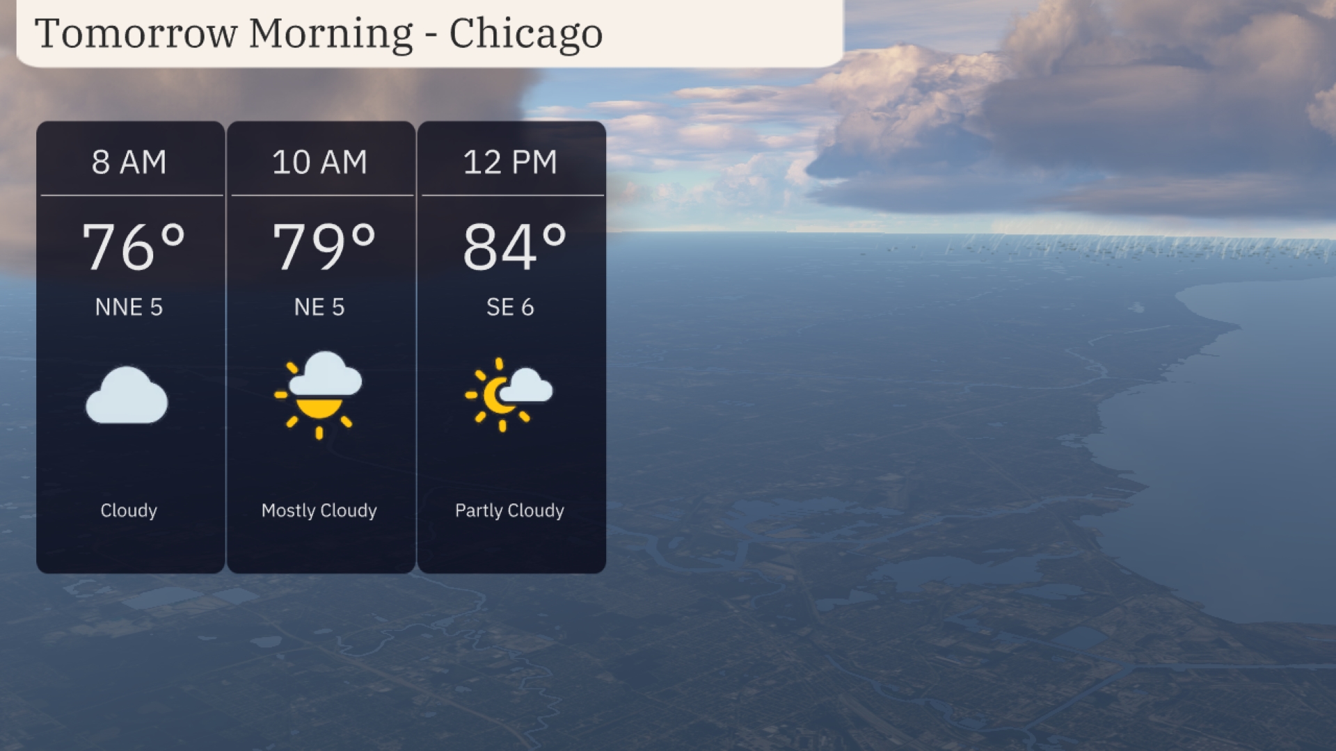 Expect a cloudy start to your morning in Chicago, with temperatures beginning at 76 degrees and winds from the north-northeast at 5 miles per hour. By 10 AM, skies will become mostly cloudy, and temperatures will rise to 79 degrees as winds switch slightly to the northeast. Moving towards noon, temperatures will reach a pleasant 84 degrees, accompanied by partly cloudy skies and a subtle southeast breeze at 6 miles per hour. Perfect for any outdoor plans you might have.