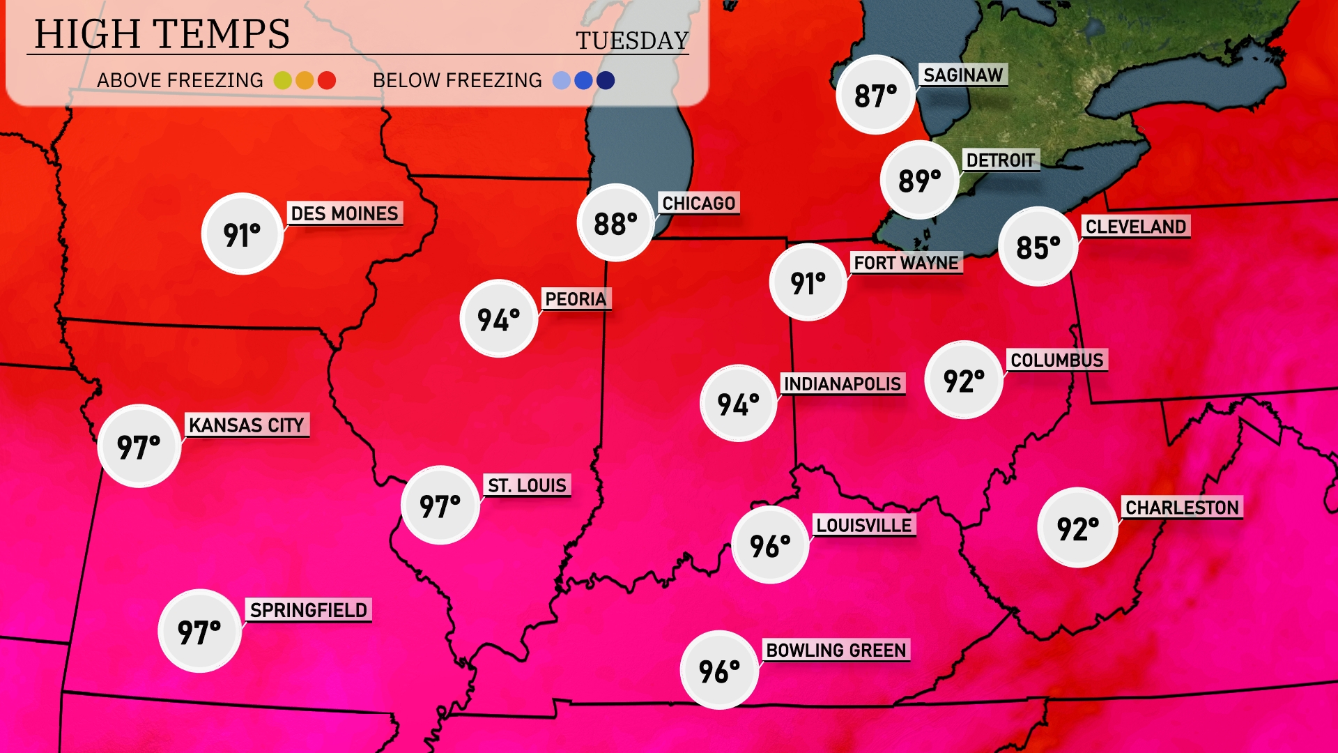 Tomorrow in the Midwest, expect a sizzling day with high temperatures reaching up to 97 degrees in Kansas City and St. Louis. Springfield is also on track for a warm 97 degrees, while Peoria sees a slightly cooler but still toasty 94 degrees. In Indianapolis and Fort Wayne, temperatures will peak at 94 and 91 degrees, respectively. Notably, many of these highs are significantly above average for this time of year, driven by high pressure dominating the region.