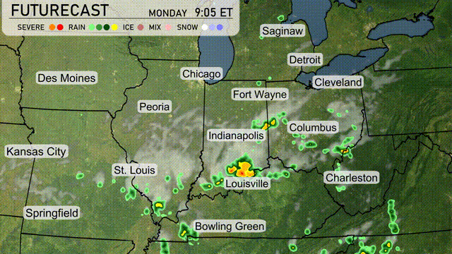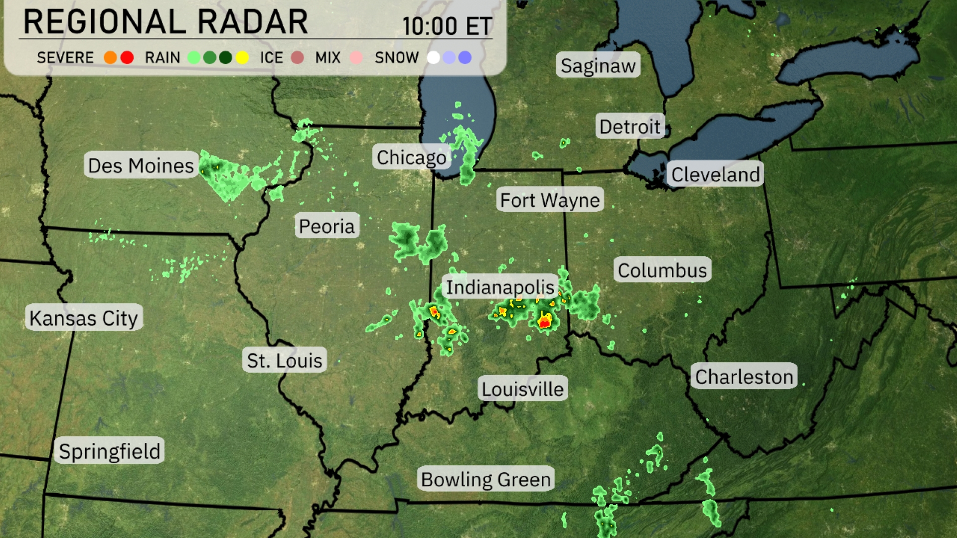 Over the Midwest, a cluster of thunderstorms is currently active around Indianapolis, moving eastward. Rain is scattered across southern Illinois and central Missouri, with heavier bursts near St. Louis. Northern Indiana up to Fort Wayne experiences spotty light rain, as clouds build across the region. Areas like Des Moines and Springfield remain dry, while some showers are expected to push towards Chicago later in the day.