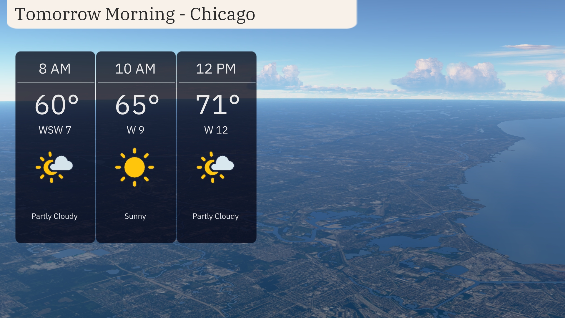 For tomorrow morning in Chicago, prepare for a pleasant start. The temperature will rise from 60 degrees at 8 AM to 71 degrees by noon. Expect partly cloudy skies early with sunshine breaking through mid-morning. Winds will transition from west-southwest at 7 mph to west at 12 mph by midday, creating a refreshing breeze.