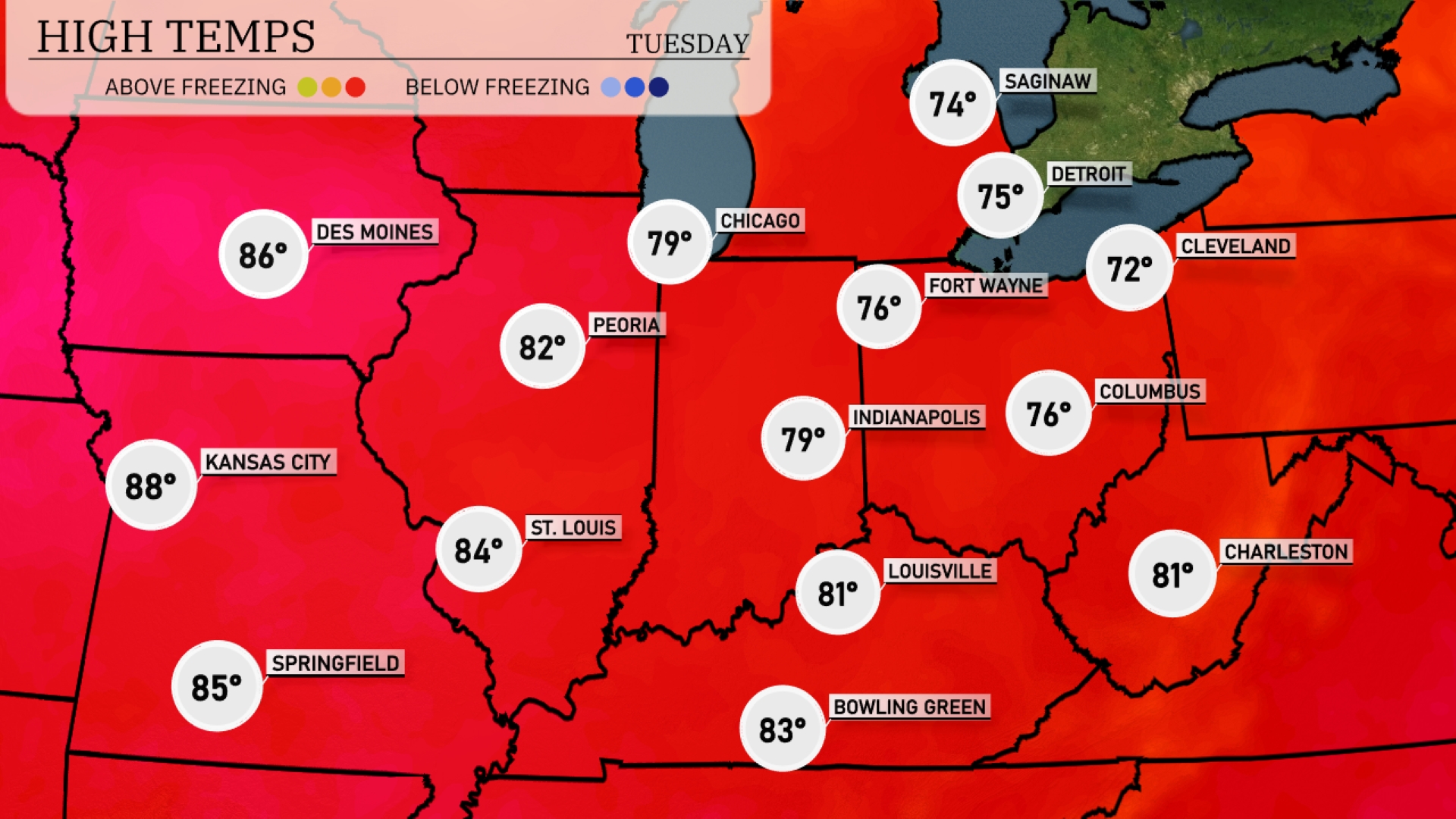 Tomorrow in the Midwest, Kansas City is set to soar to a high of 88 degrees, while St. Louis follows closely at 84. Des Moines will warm up to 86 degrees, and Peoria is expected to hit 82. Indianapolis and Fort Wayne will see highs around 79 and 76 respectively, with Columbus reaching 76 degrees.