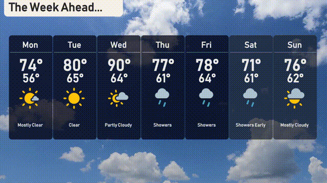 Wednesday: Partly cloudy skies will dominate, with temperatures climbing to a warm 90 degrees and dipping to 64 overnight.