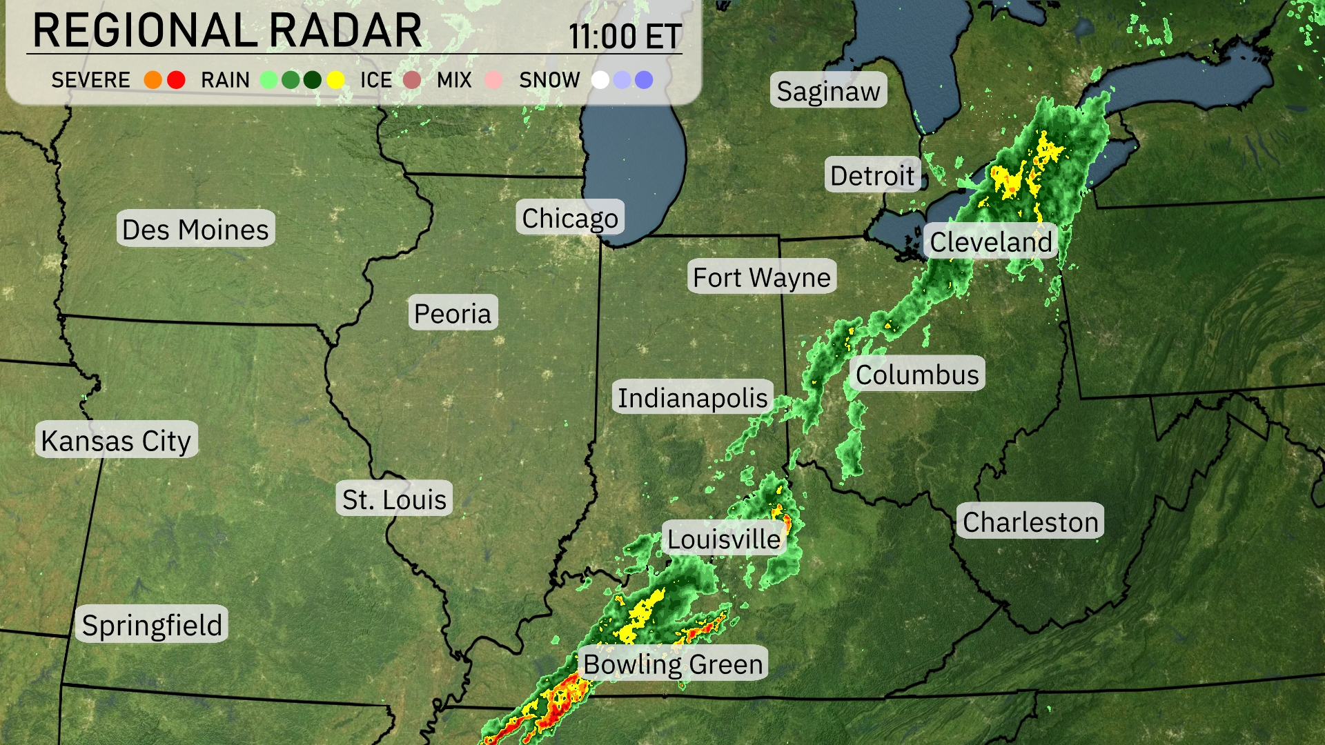 A line of thunderstorms is sweeping through the Midwest, with intense activity stretching from Bowling Green up to Cleveland. Louisville is experiencing heavy storms that are progressing towards Indianapolis. As rain showers continue moving northeast, Fort Wayne and Detroit are experiencing persistent rain, marking a wet day ahead for these areas. Clear conditions prevail in Des Moines and Kansas City, providing a contrast to the more turbulent weather further east.