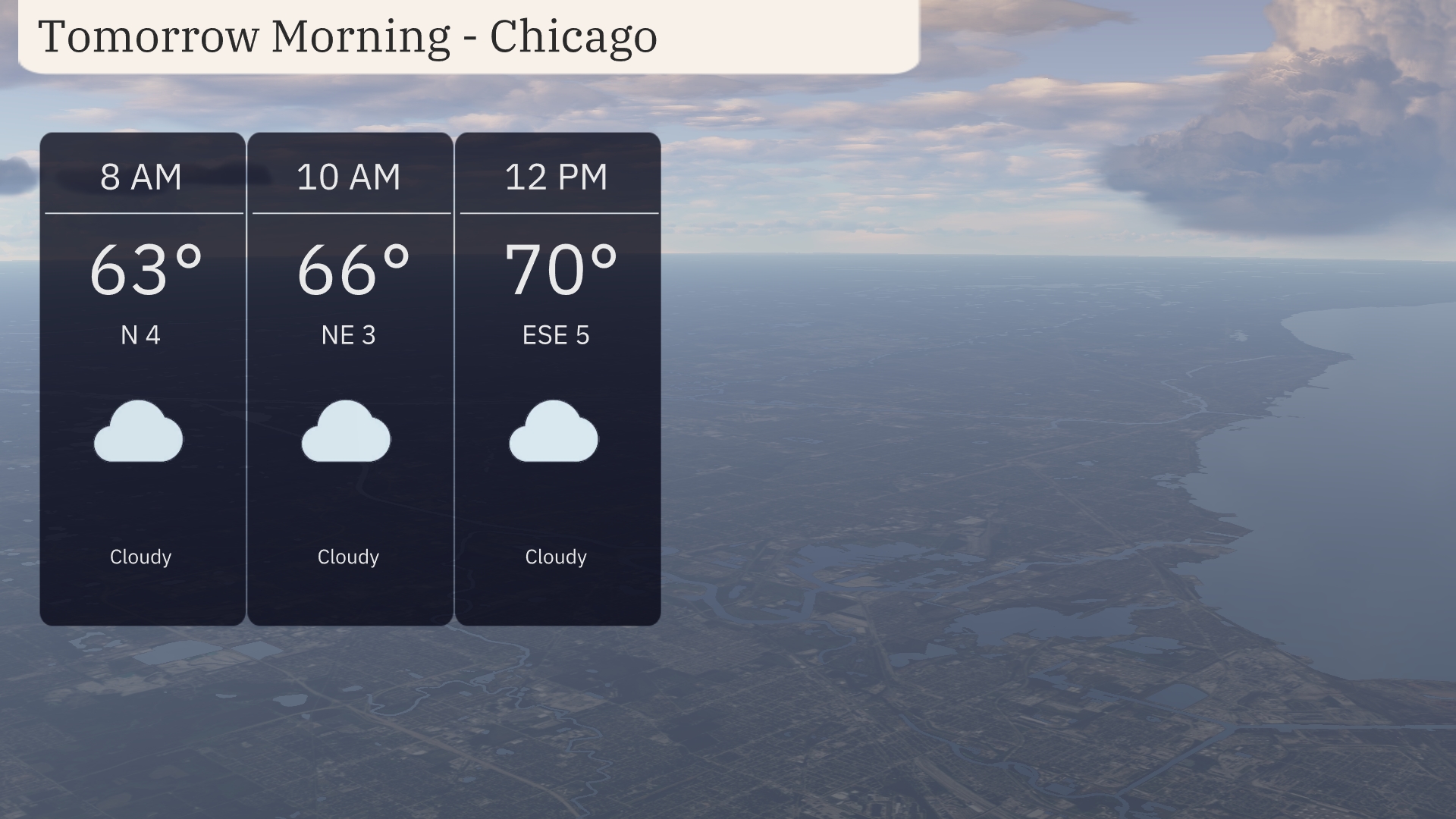 In Chicago, tomorrow morning starts off cloudy with temperatures around 63 degrees by 8 AM, warming to 66 degrees by 10 AM. Winds initially from the north at 4 mph shift to a northeast direction at 3 mph by mid-morning. Temperatures continue to gradually rise, reaching 70 degrees by noon with an east-southeast breeze at 5 mph.