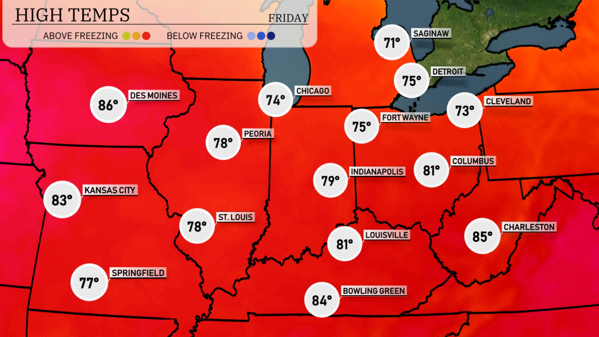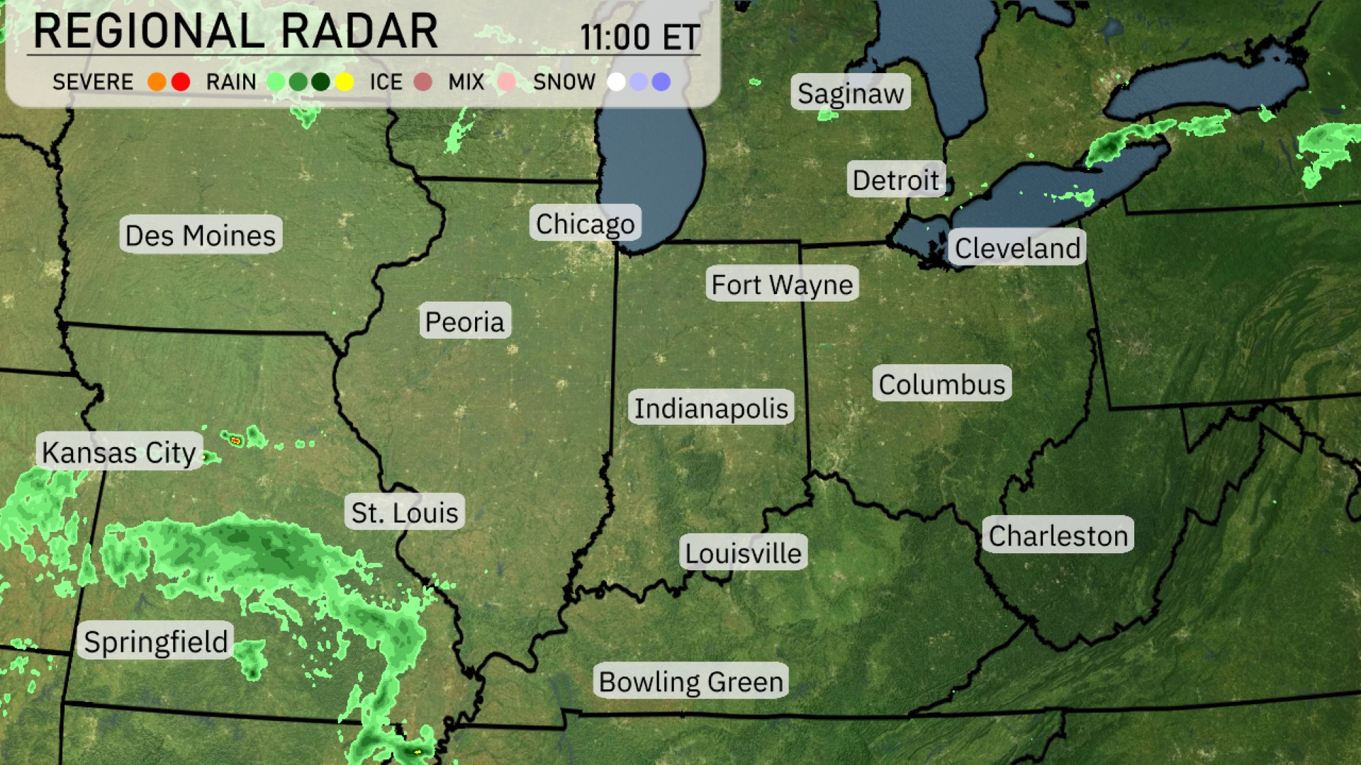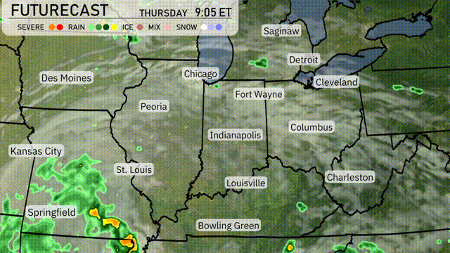 A frontal system will move into the Midwest, bringing showers and thunderstorms to areas like St. Louis and Springfield by Thursday morning. Expect heavy rainfall in these regions, with potential for flooding in low-lying areas. By midday, storms will expand towards Indianapolis and Chicago, increasing the chances for localized downpours. Temperatures will remain warm ahead of the front, but cooler air will follow as the system exits eastward.